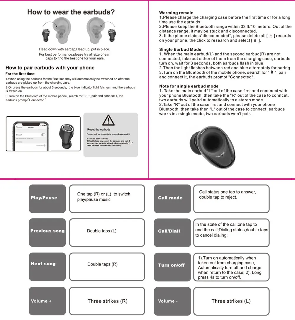 Особенности: Новейшая бинауральная стереогарнитура TWS с чипом 5,0 обеспечивает высокую производительность беспроводной связи. Чип 5,0 очень хорошо работает от аккумулятора, что позволяет слушать в течение 4 часов на одной зарядке. Новейшее поколение bluetooth-гарнитур TWS, смарт-отсеков для зарядки, магнитного удара и электрической зарядки, для достижения настоящей беспроводной непрерывной мощности. Он принимает чип Bluetooth V5.0, расстояние подключения 10 м, стабильная производительность, высокая передача, низкое потребление и сильная совместимость. Эргономичный дизайн для более удобной посадки на ушной раковине. Конструкция с двумя ушками позволяет использовать одно ухо отдельно, что эквивалентно двум автономным Bluetooth-гарнитурам. Сильная совместимость, IOS/Android универсальный, управление одной кнопкой, простой и стильный. Параметры: Версия Bluetooth: 5,0 EDR Режим протокола: A2DP, AVRCP, HSP, HFP, SPP, PBAP Управление метод: сенсорный экран Для пульта дистанционного управления на английском языке Дальность передачи: ≧ 10 м Амплитудно-Частотная характеристика: 100Hx-8KHz Соотношение сигнал/шум: ≧ 70 дБ Водонепроницаемый Рейтинг: IPX5 Внешний материал: АБС-пластик Тип батареи: полимерная литиевая батарея Выход USB: 5 в 1 А Способ зарядки: зарядка в зарядном блоке, usb-разъем, Магнитная Зарядка для наушников Емкость аккумулятора наушников: 50 мА · ч Емкость аккумулятора: 2200 мА · ч Время зарядки наушников: около 1-2 часов Время вызова: 3-4 часа Время работы: 3-4 часа