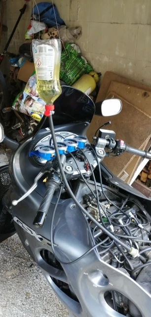Surtout bien mettre les petits robinets et régler le débit grâce à eux, sinon les aiguilles vont osciller très vite et rendre la lecture impossible. Comme ma moto est à refroidissement par air, j'ai positionné un ventilateur devant le moteur.