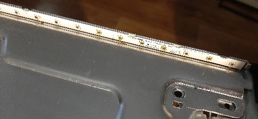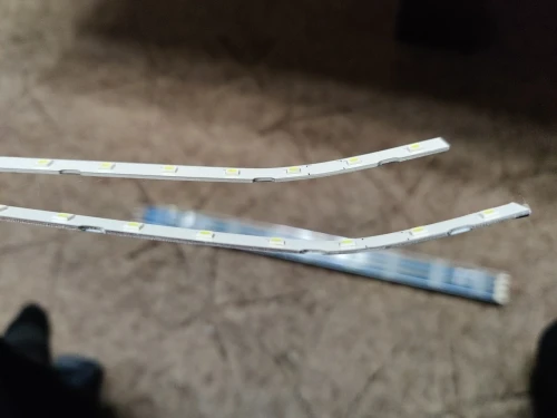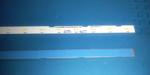 Я проверил параметры светодиодов в планках на 43 и 49". В 43" планках светодиоды потребляют 220мА при 6.4V. В оригинальных светодиодах AOT светодиоды потребляют 260мА при 6.4V. В планках на 49" стоят другие светодиоды. Они потребляют 400мА при 6.4V Но в оригинальных планках от Samsung со светодиодами AOT есть защитные стабилитроны. В этих планках на 43" они тоже есть. а Вот в планках на 49" защиты нет. В прошлой посылке этого продавца были другие светодиоды. Это значит, что при выходе из стоя всего лишь 1 диода вся линейка потухнет сразу. При этом ток с блока питания, 680мА который рассчитан на 2 параллельные планки (по 340мА на каждую) идет на 1 планку. И от этого светодиоды моментально раскаляются, плавят оргстекло световода и сами перегорают.