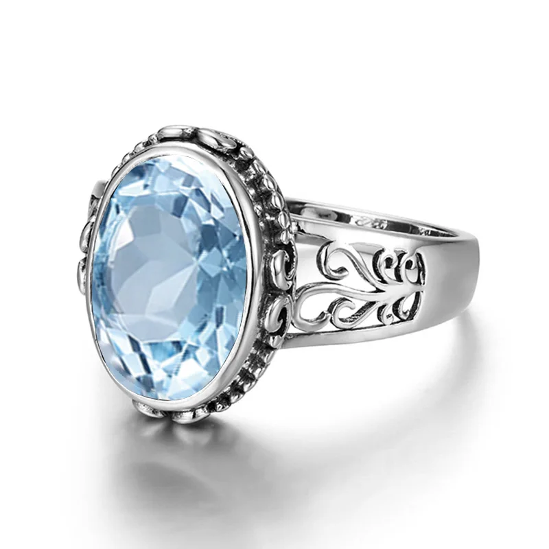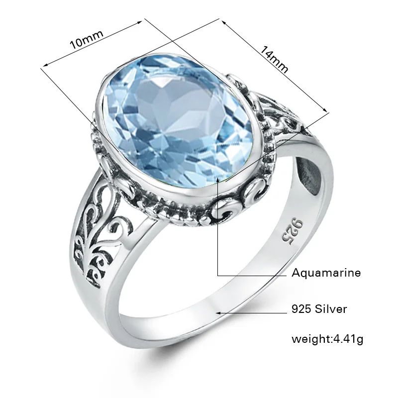 Бренд: Rosewood StoryТип камня: аквамаринРазмер основного камня: 10*14 ммЧеткость камня: VVSЦвет камня: ПрозрачныйФорма камня: ОвальныйТип металла: серебро 925 пробыМатовый цвет: античное сереброВес изделия: 4,41 гРазмер кольца: США #5,#6, #7,#8,#9,#10