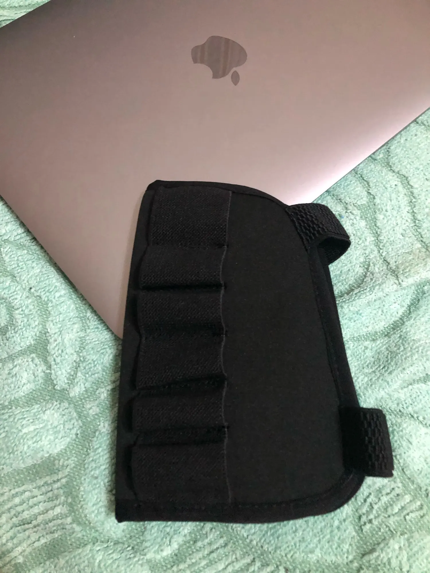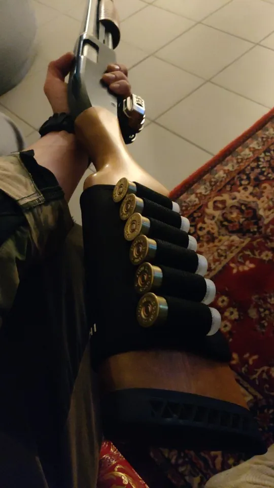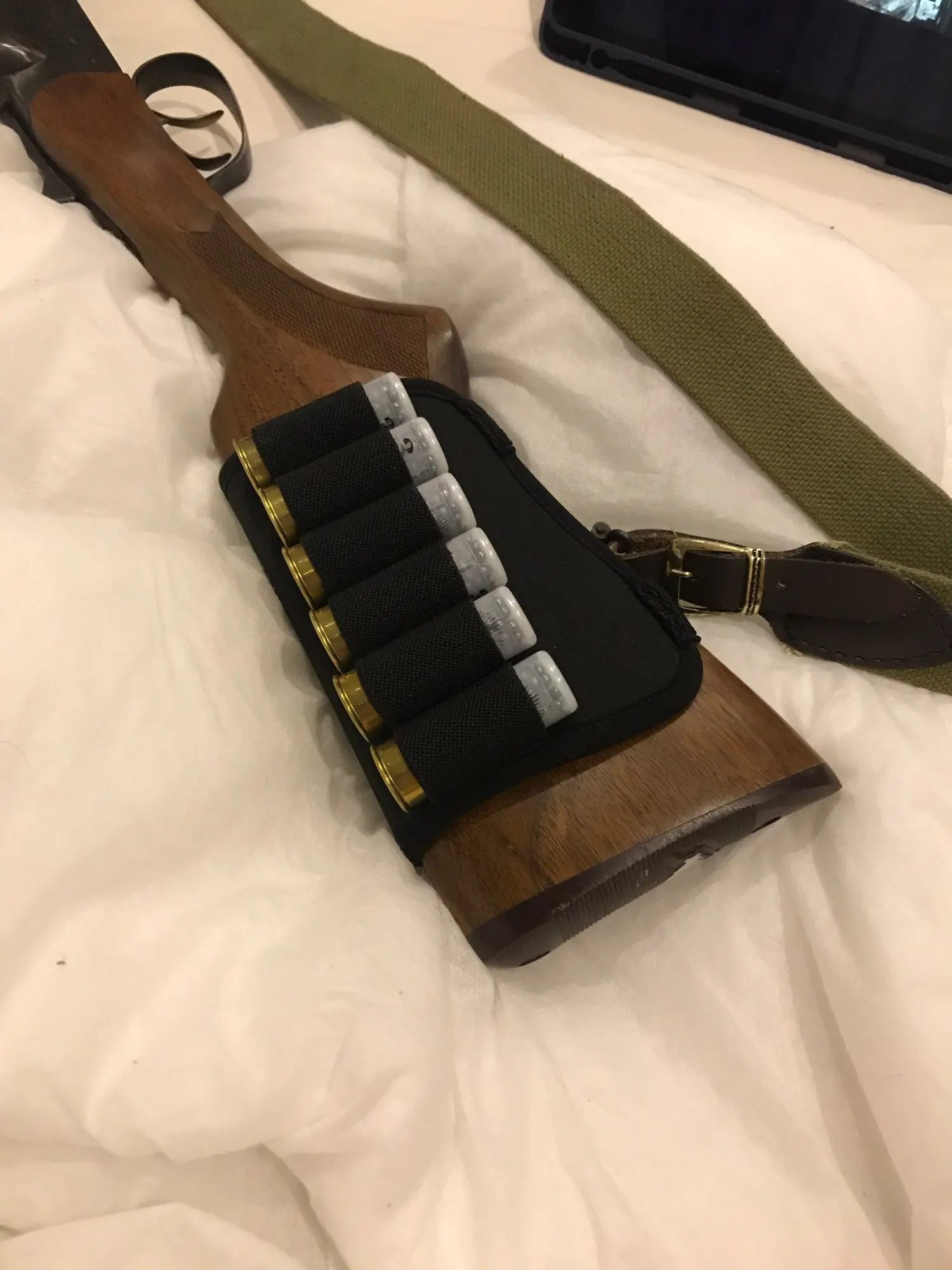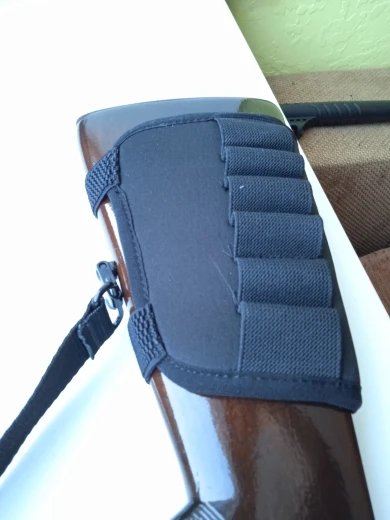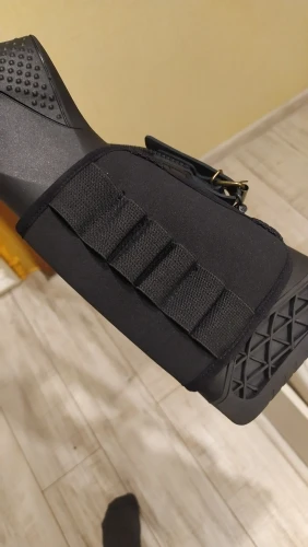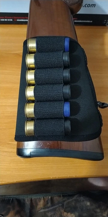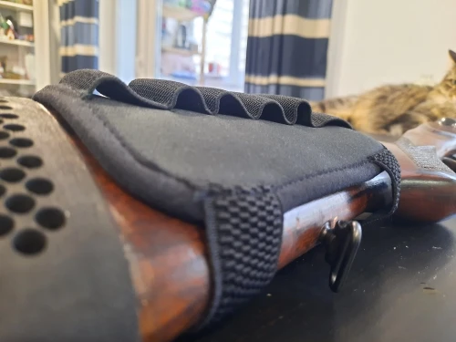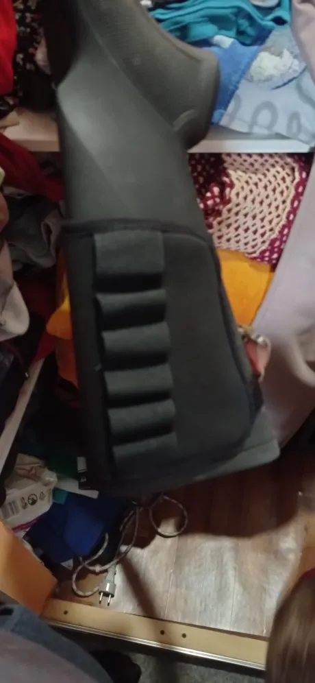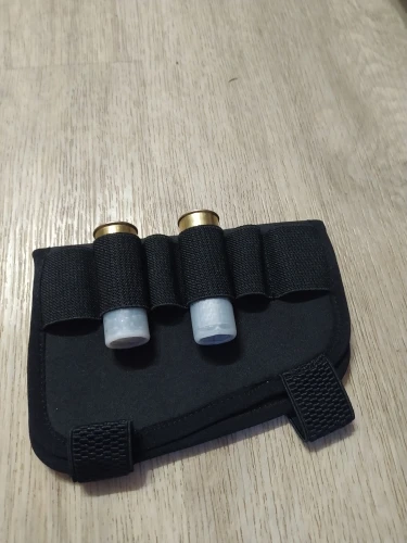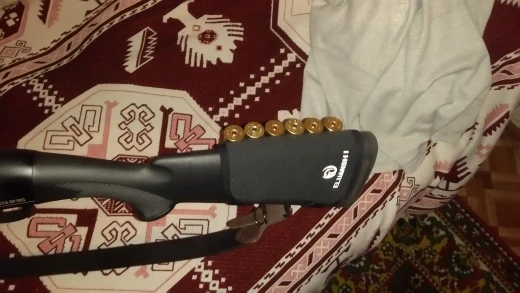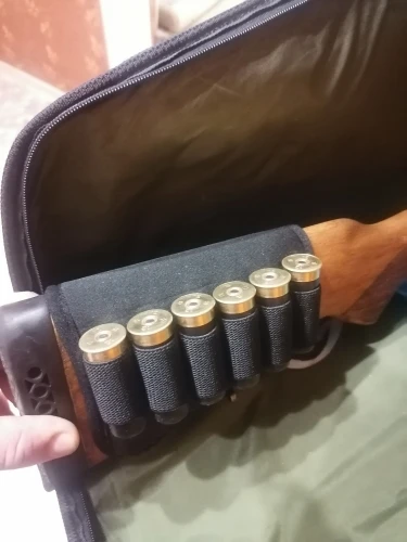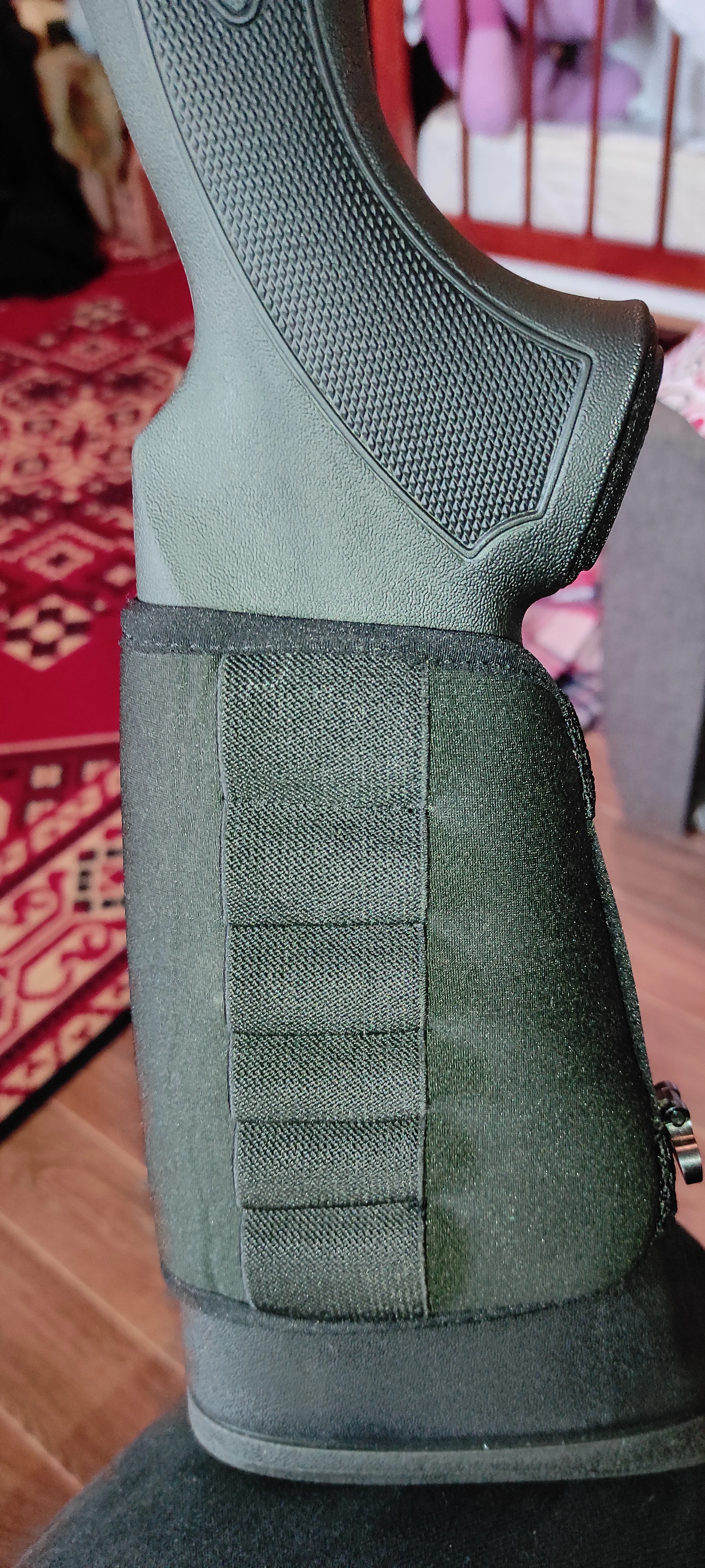 Не имитация, сделано нормально, смотрится не совсем позорно. Снаружи неопрен, изнутри вроде липкой резины. На приклад двустволки сел точно, не ползает. Патроны 12 к. сидят плотно, вынимаются легко. Щеке, понятно, слегка теплее на минусе. Если ружье не крутить, сильно не мешает. Приклад не царапается.