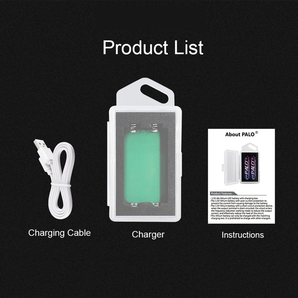 1. Данный usb только зарядное устройство можно заряжать портативным зарядным устройством PALO 2800mWh 1,5 V AA литиевый перезаряжаемый аккумулятор, пожалуйста, не пытайтесь использовать его для зарядки других 1,5 V или 1,2 V батарея.2. Это зарядное устройство можно использовать в качестве аккумуляторной коробки, надежного качества, легко носить с собой.3. Посылка включает зарядное устройство usb, Кабель micro-usb и инструкции.