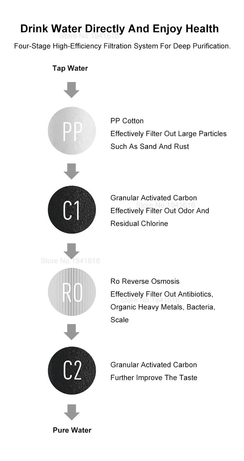 Очиститель воды Xiaomi 500G / 1A кухонный фильтр обратного осмоса (500G) Параметры продукта Вес нетто продукта: 1,25 кг Модель продукта: YM3012-500G Вес брутто продукта: 1,50 кг Размер упаковки: 123 × 123 × 406 мм Цвет продукта: белый Количество товаров: 1 Теоретическая точность фильтрации: 0,0001-0.001um (микрон) Применимый источник воды: муниципальная водопроводная вода Применимая температура воды: 5 ~ 38 ° C Рекомендуемый цикл замены: не более 24 месяцев Рабочее давление мембраны Ro: 0,4 ~ МПа Номинальный общий объем чистой воды: 7200 л (объем чистой воды) Расход проточной воды: 1,3 л/мин Расход проточной воды: 1,3 л/мин Основная функция: Теоретическая точность фильтрации может достигать 0,0001 микрон, эффективно перехватывая бактерии, тяжелые металлы, органические вещества и другие вещества в воде