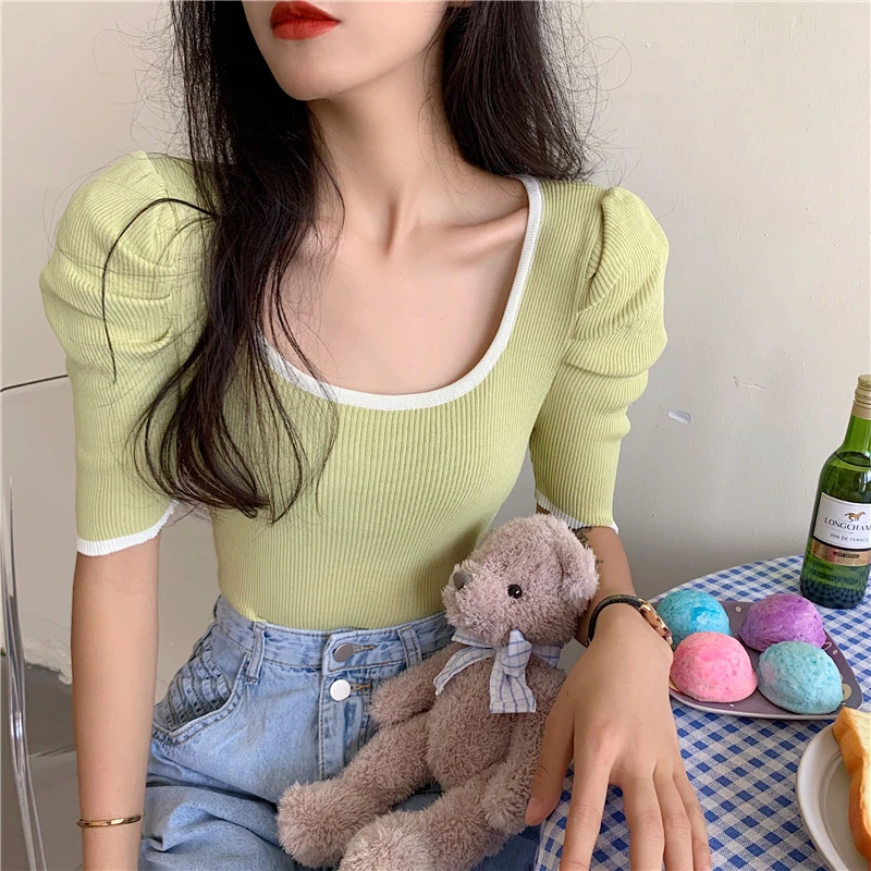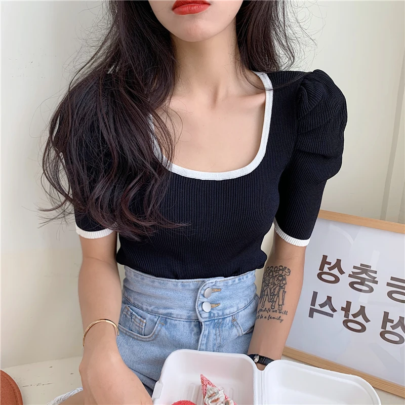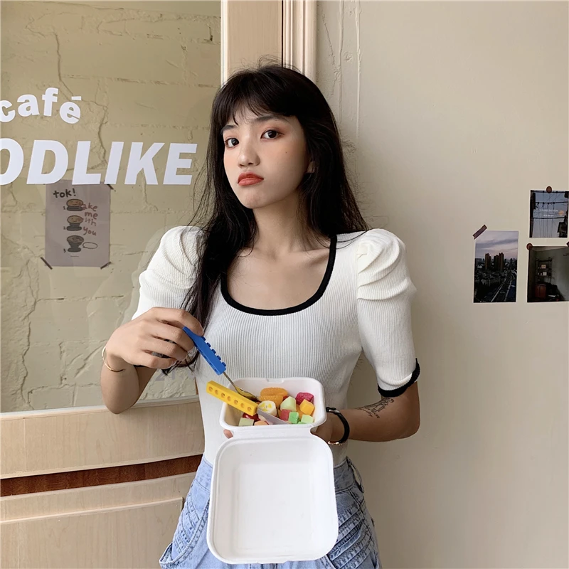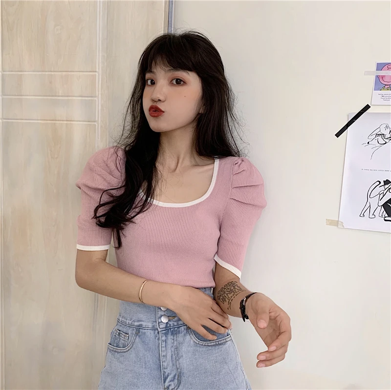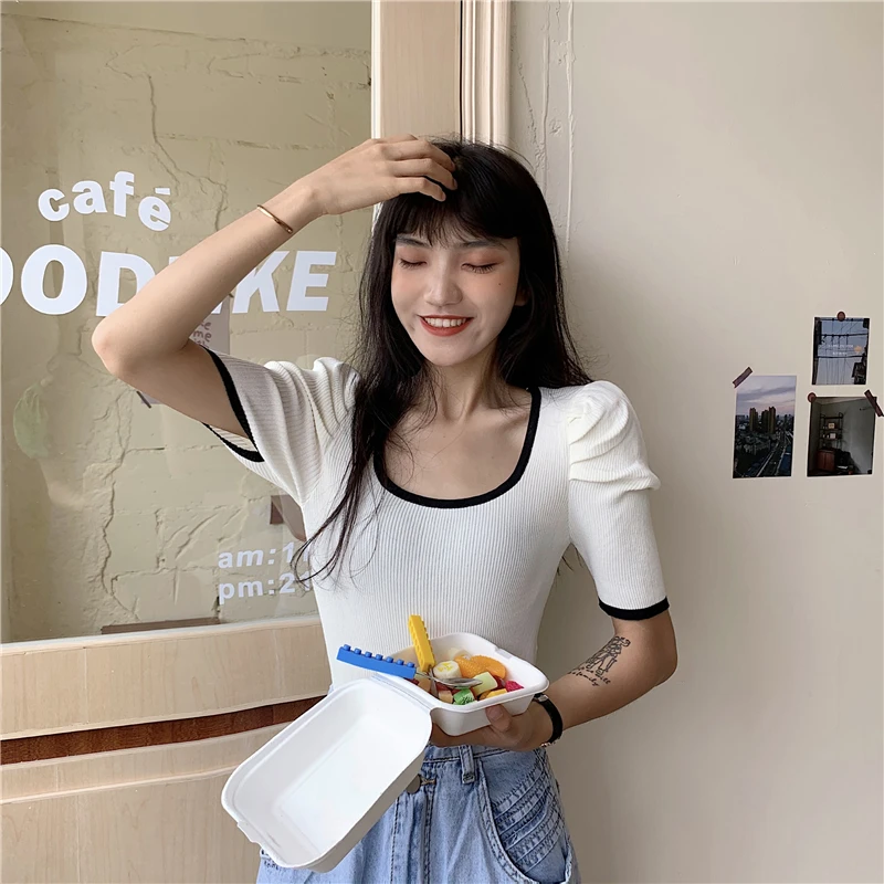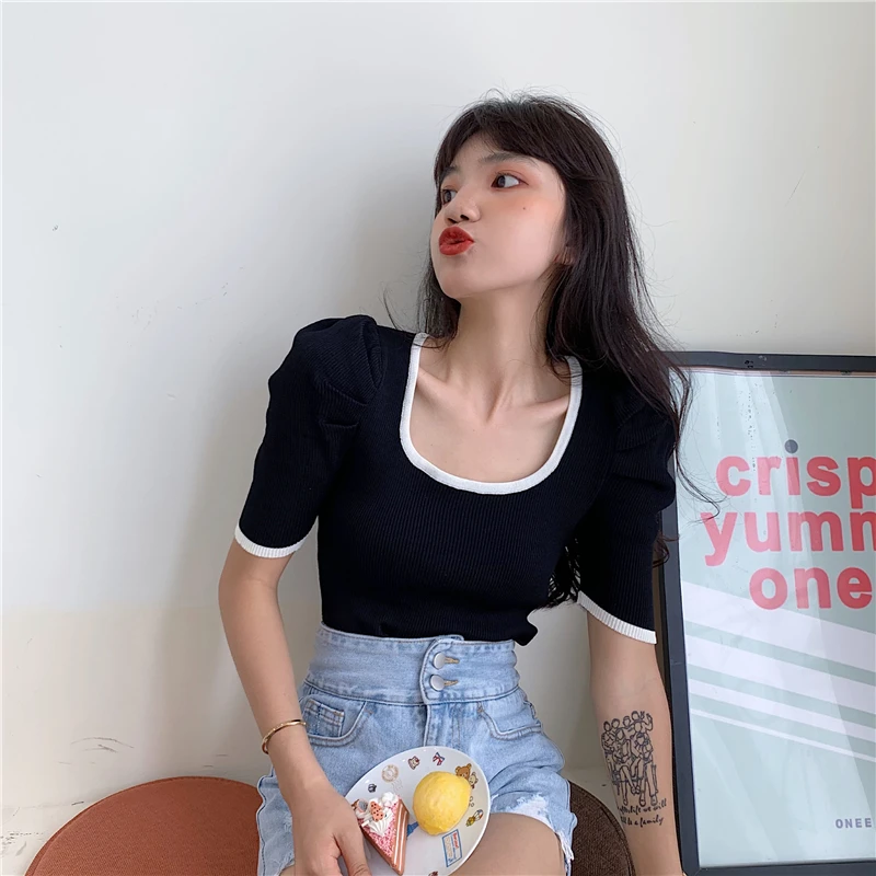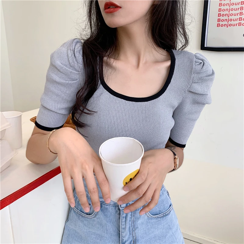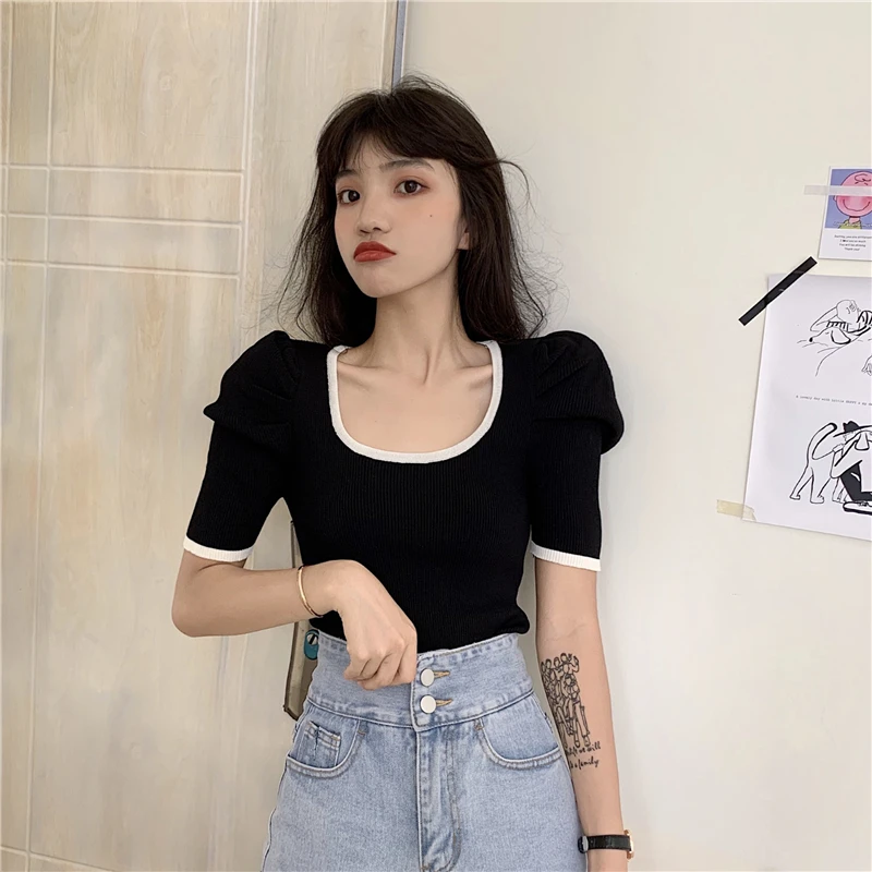 Женская футболка с короткими рукавами-фонариками, Модный Эластичный кроп-топ с заплатками и квадратным воротником для девушек на лето