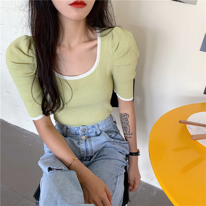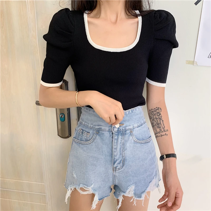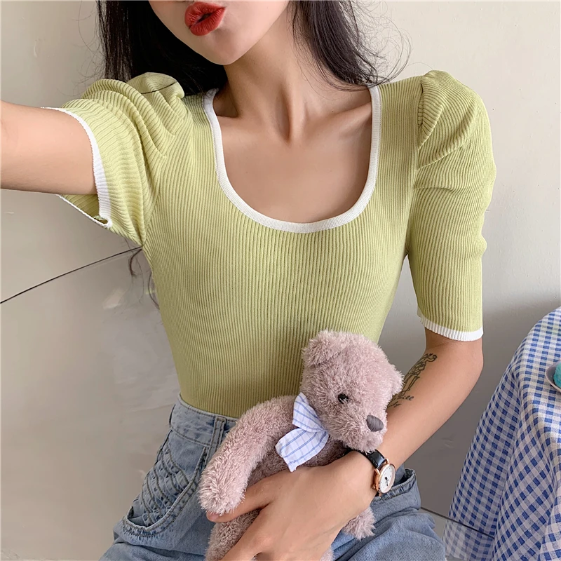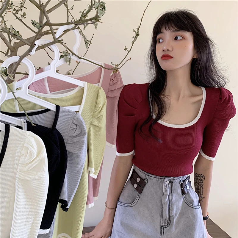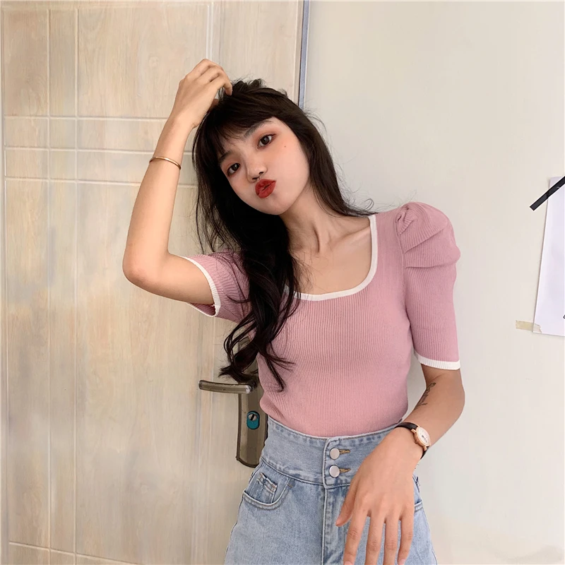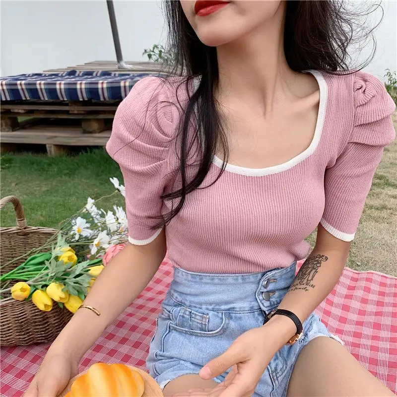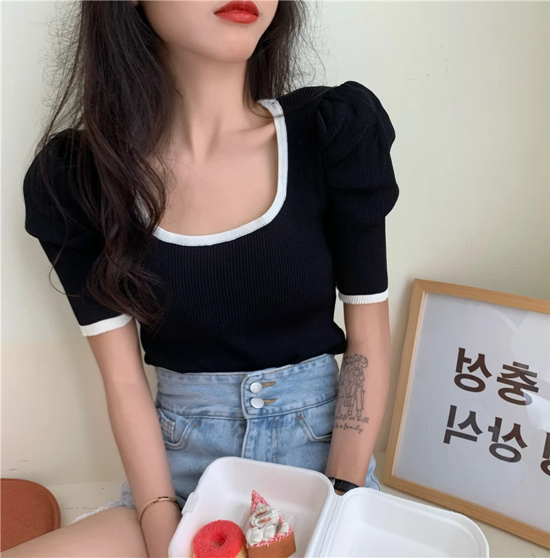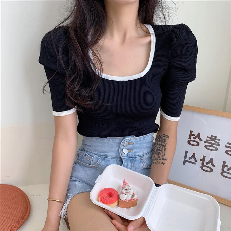 Женская футболка с короткими рукавами-фонариками, Модный Эластичный кроп-топ с заплатками и квадратным воротником для девушек на лето
