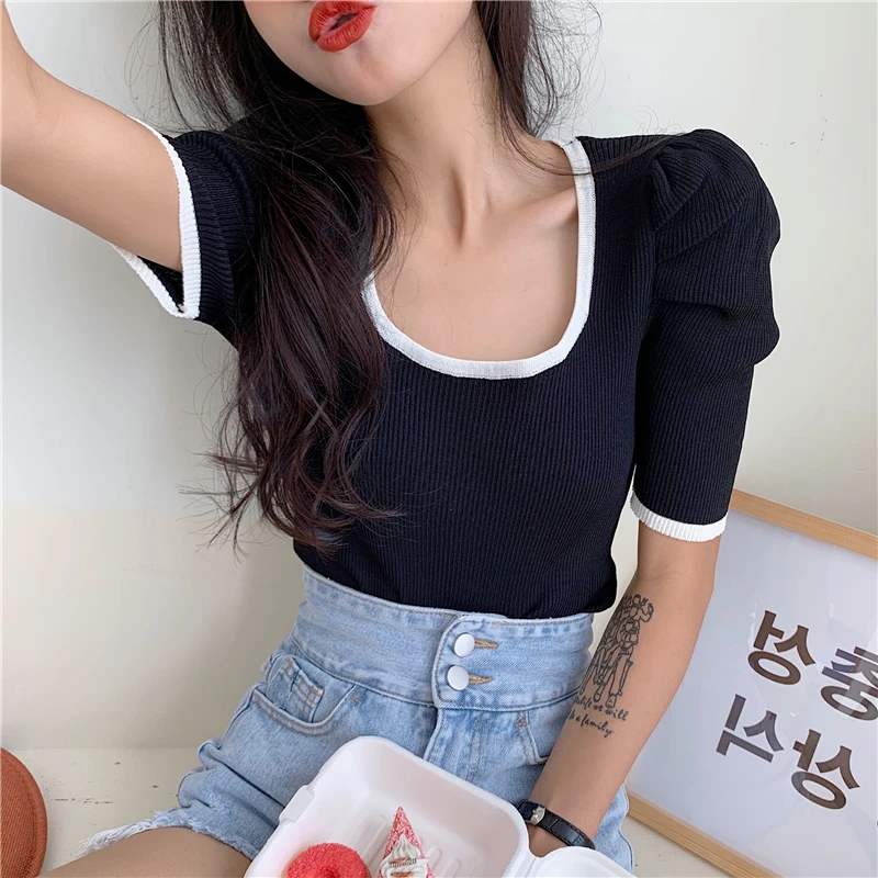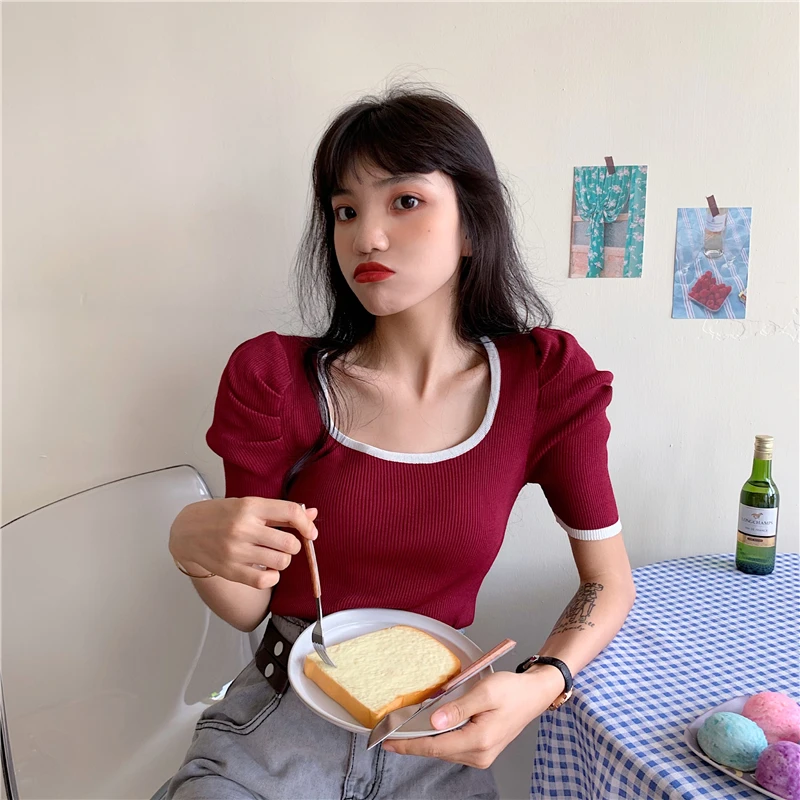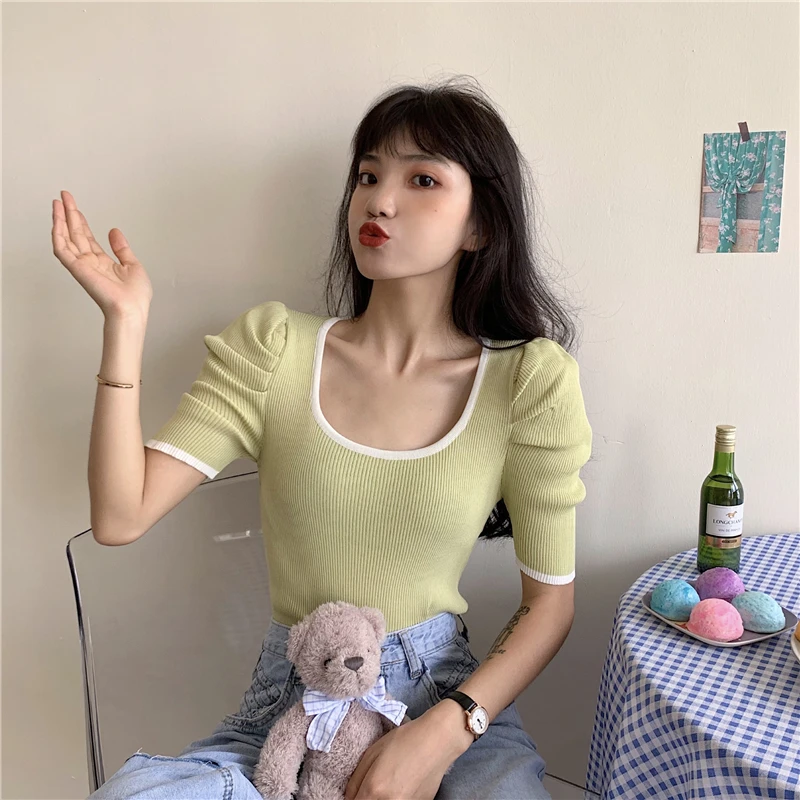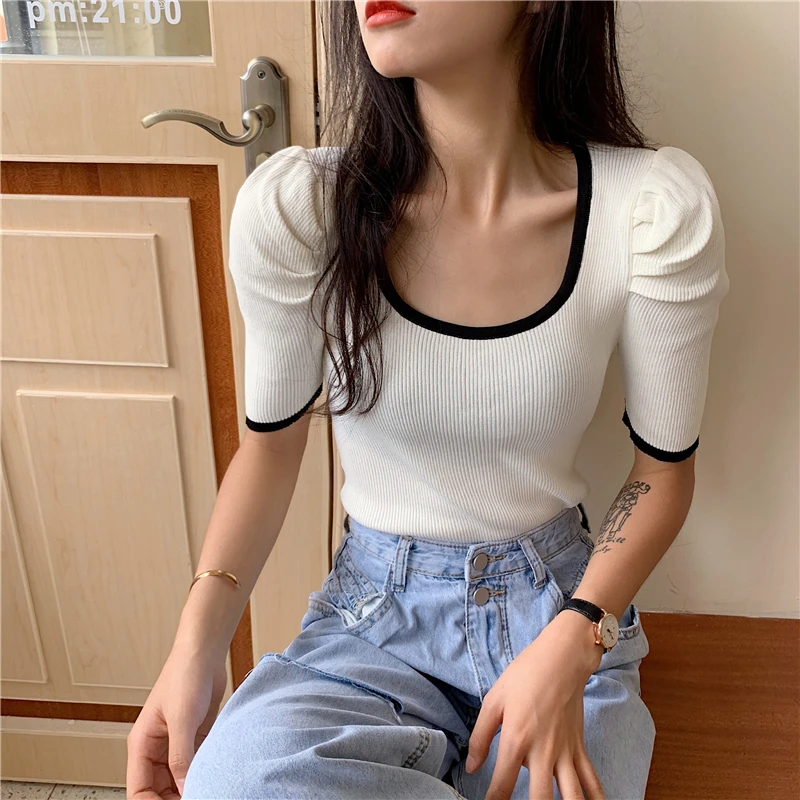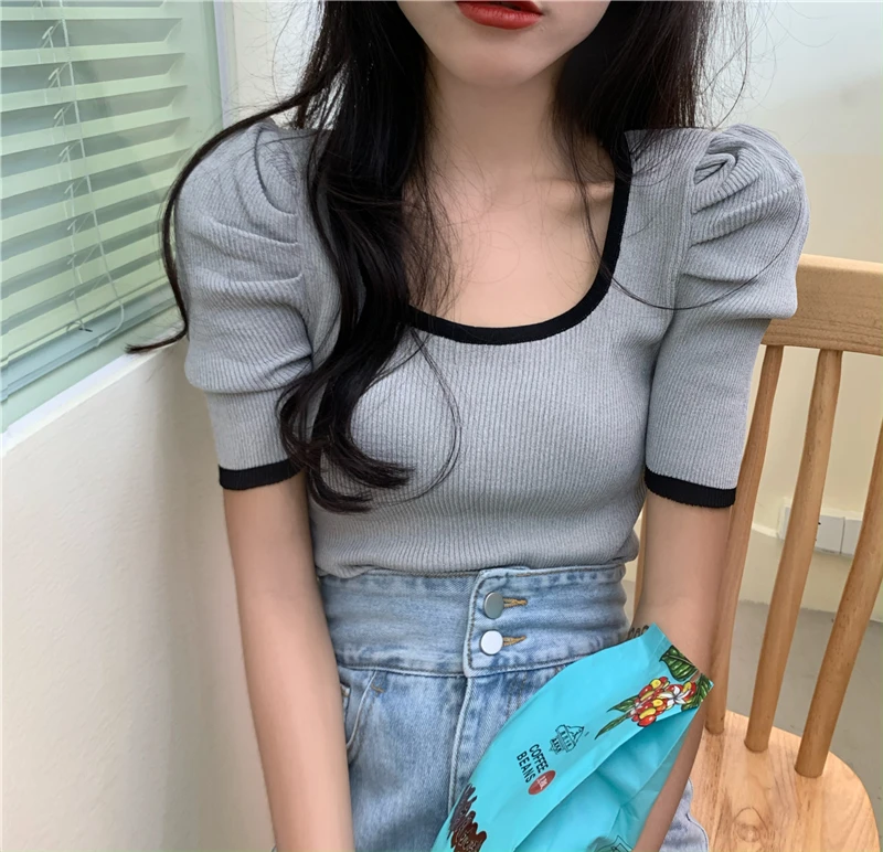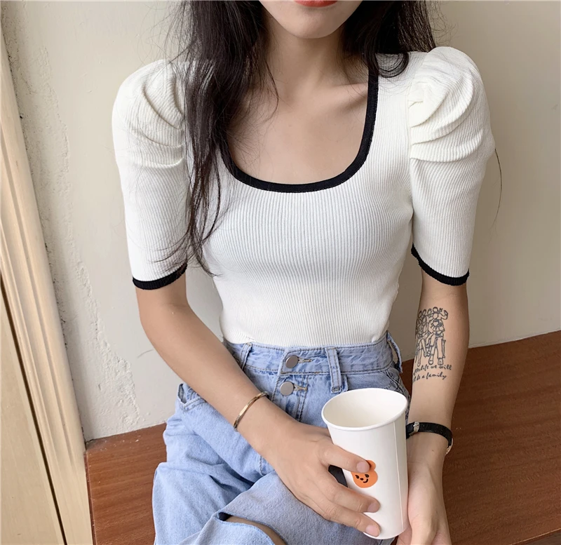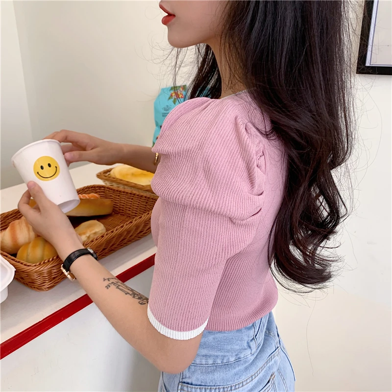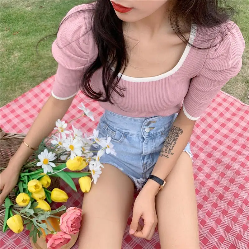 Женская футболка с короткими рукавами-фонариками, Модный Эластичный кроп-топ с заплатками и квадратным воротником для девушек на лето