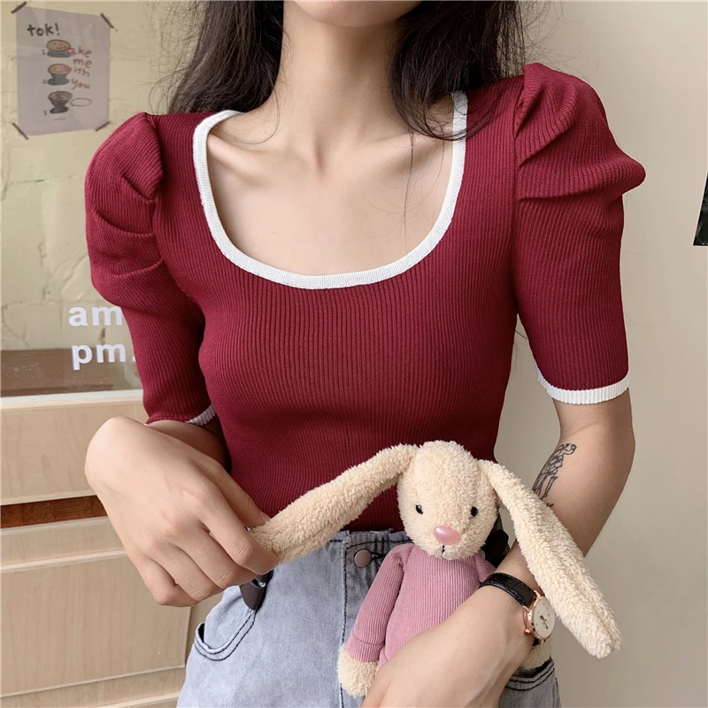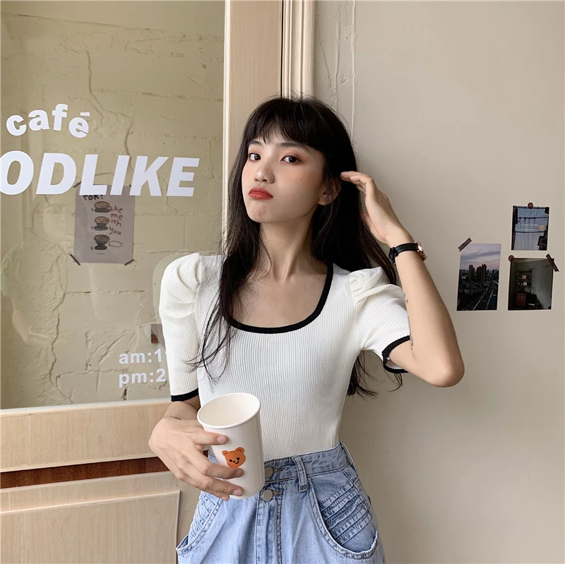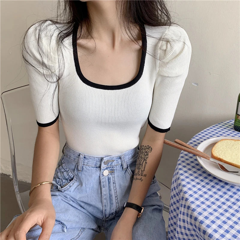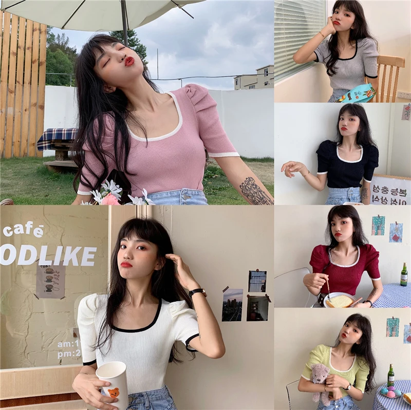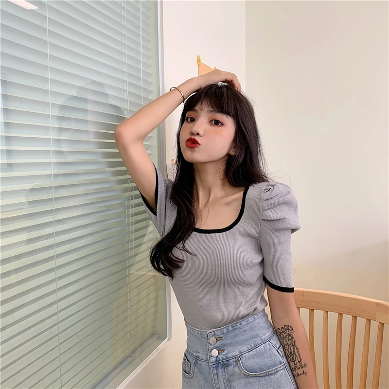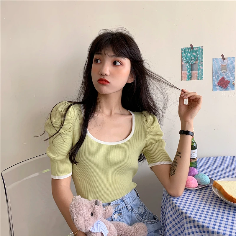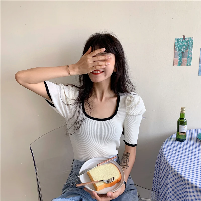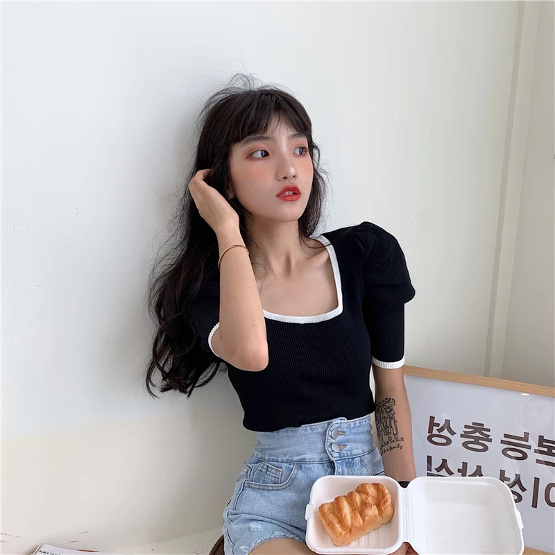 Женская футболка с короткими рукавами-фонариками, Модный Эластичный кроп-топ с заплатками и квадратным воротником для девушек на лето