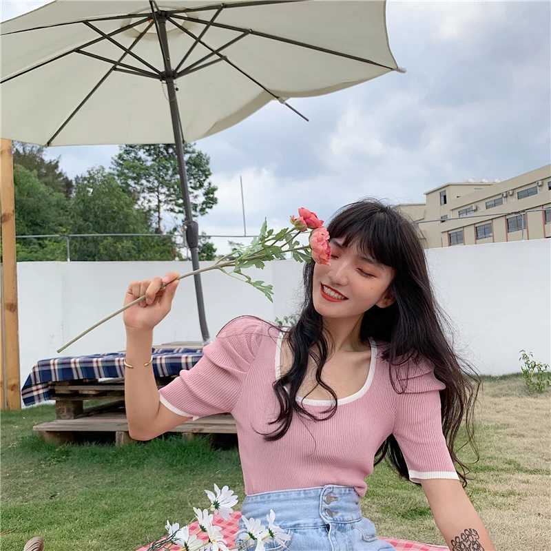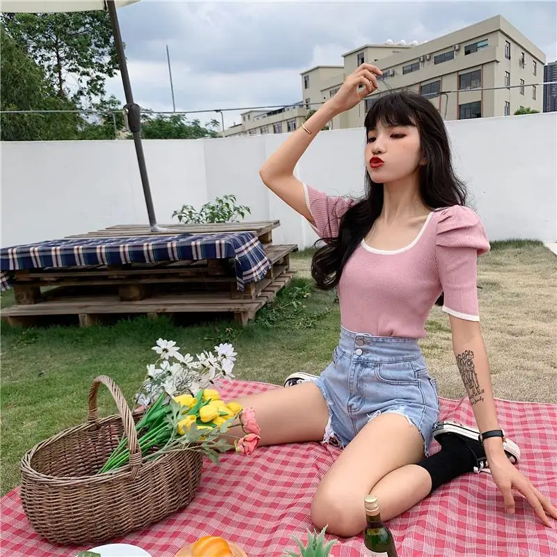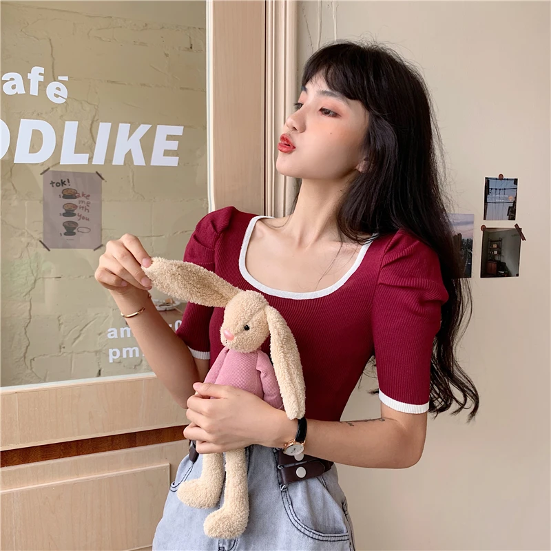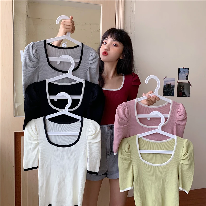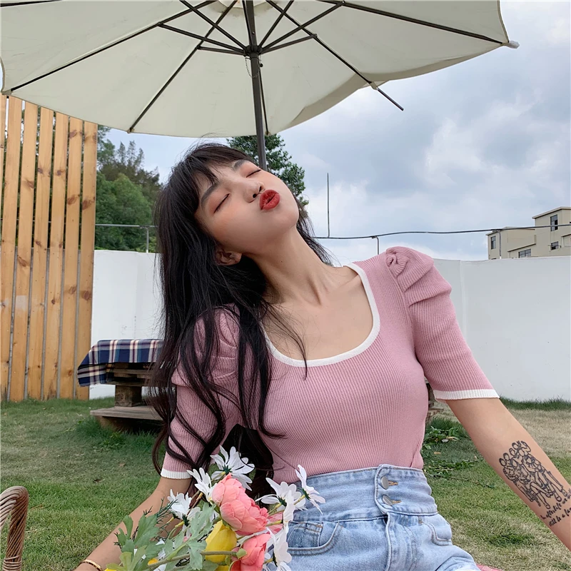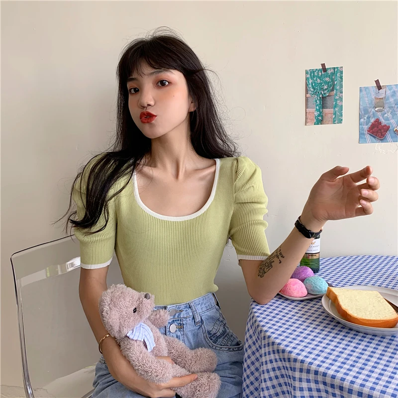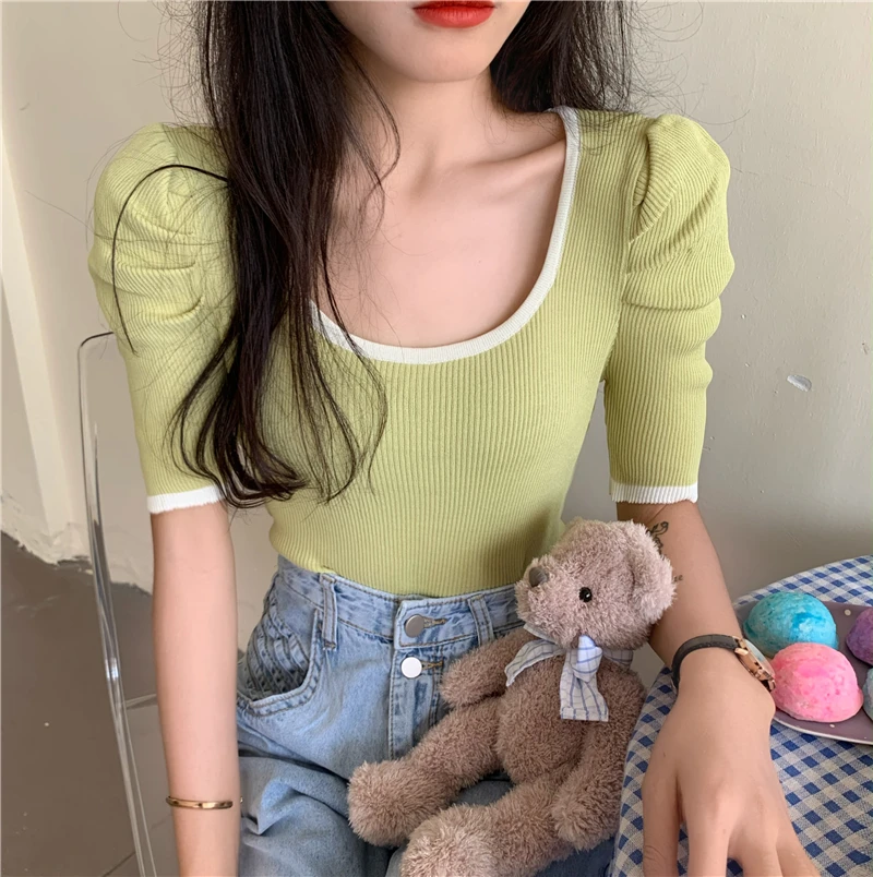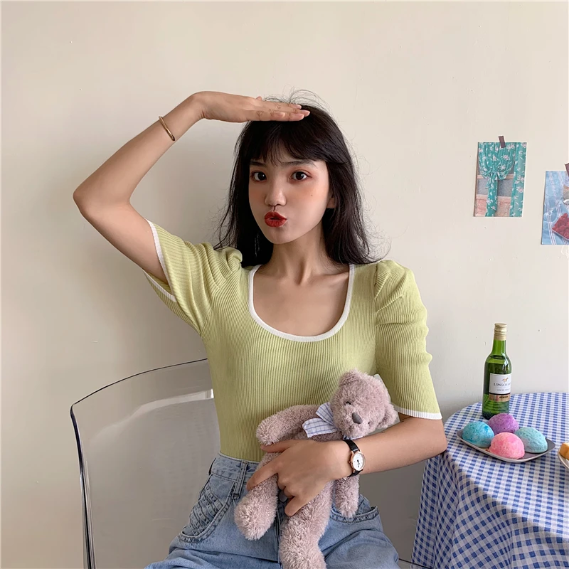 Женская футболка с короткими рукавами-фонариками, Модный Эластичный кроп-топ с заплатками и квадратным воротником для девушек на лето