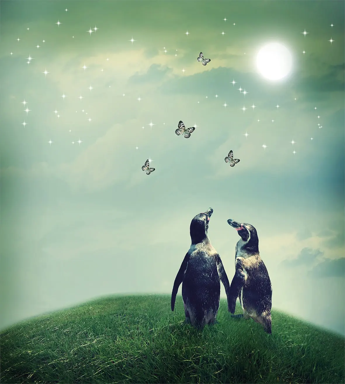 Surrealistic пододеяльник набор король Размеры пингвин пара на траве Разогревающий с солнце-бабочка 3 предмета Постельное белье зеленого цвета
