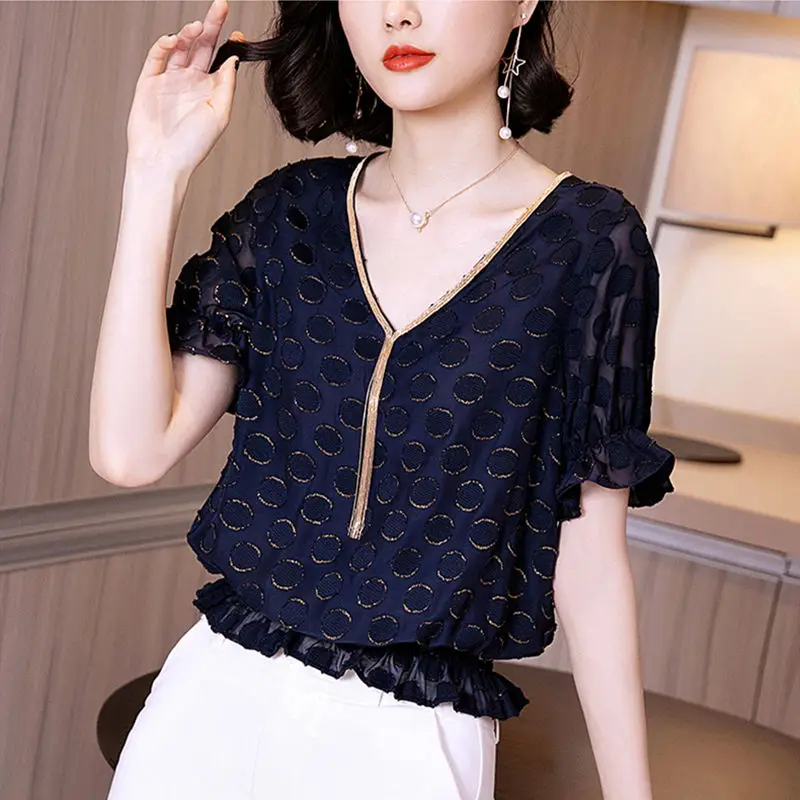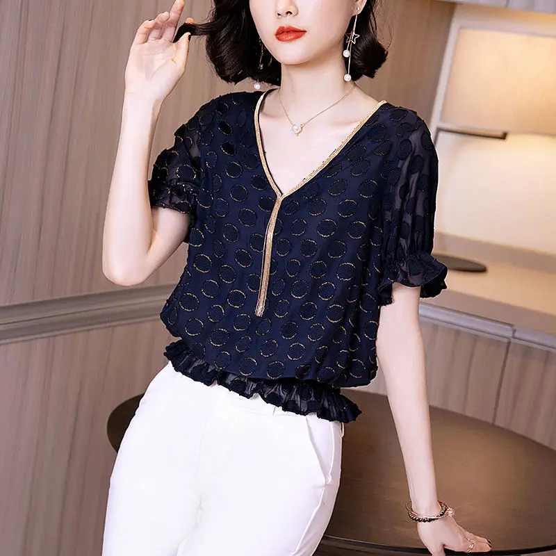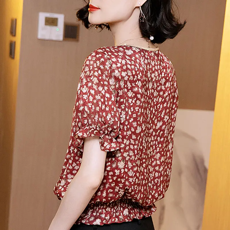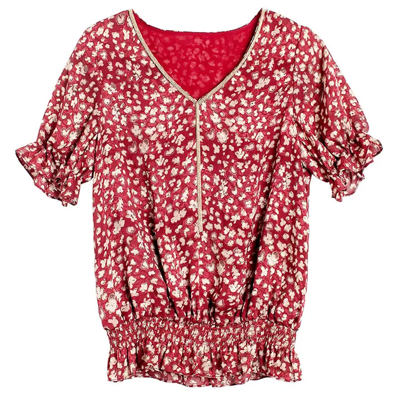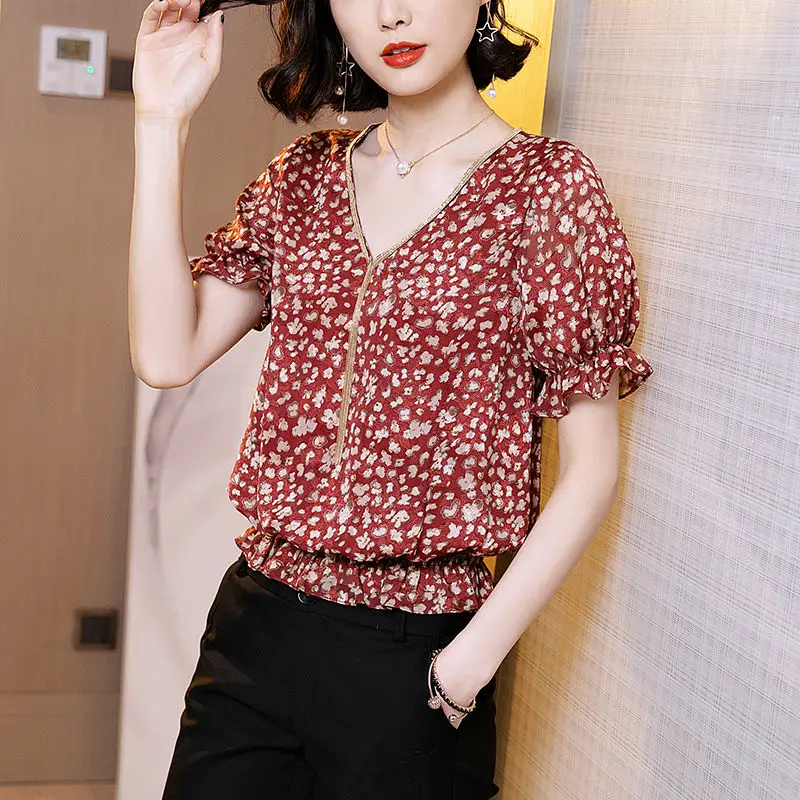 Блузка женская шифоновая с принтом, элегантная Свободная рубашка в Корейском стиле с V-образным вырезом и коротким рукавом, DD8655, весна-лето