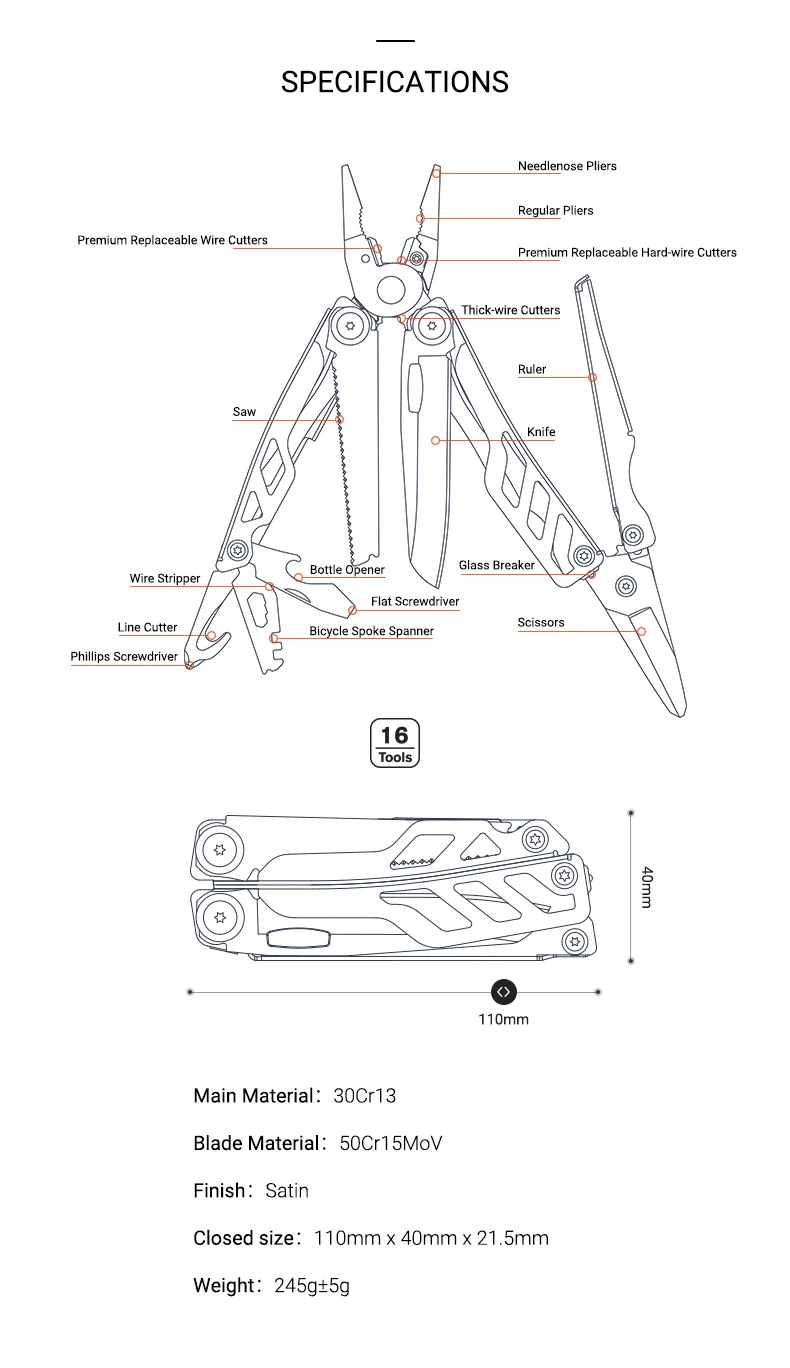 16 в 1, многофункциональные плоскогубцы, складной ручной инструмент для повседневного использования, нож, отвертка, инструменты, открывалка для пилы