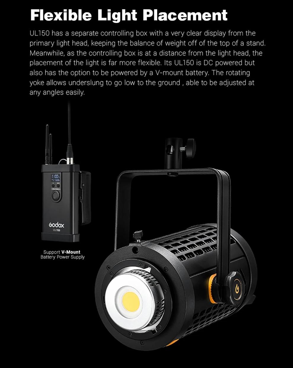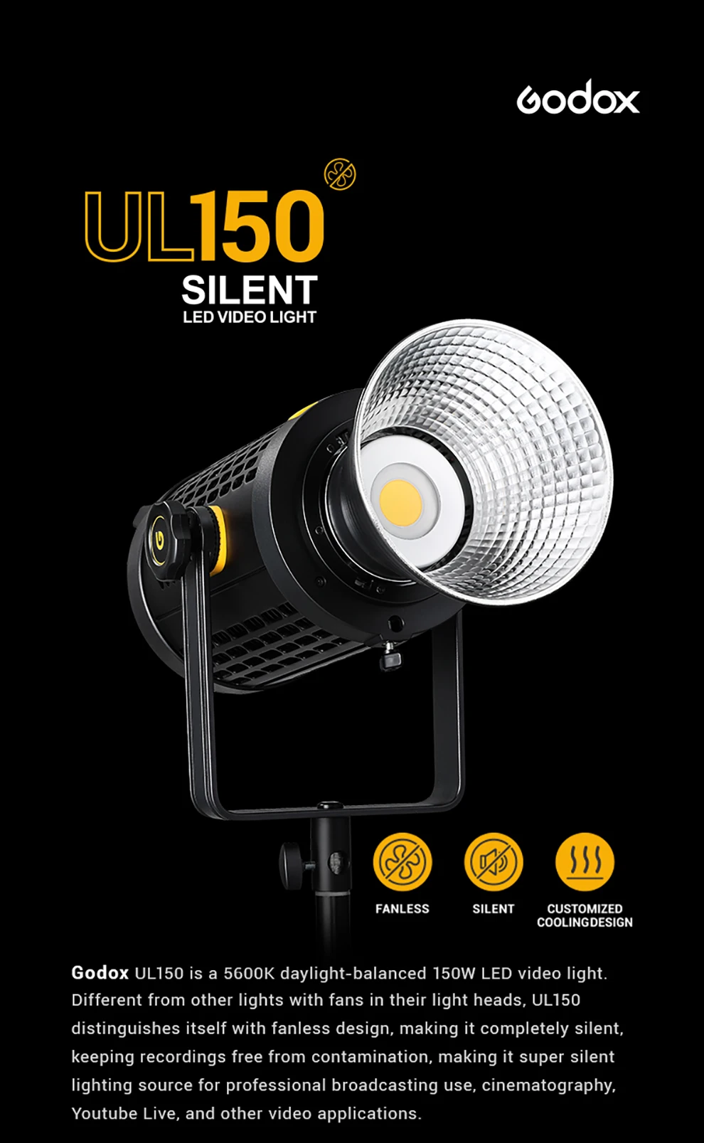 Godox UL150-это 5600K Дневной светильник, сбалансированный 150W Светодиодный светильник для видео. Она представляет новую отведение тепла система без Вентилятор охлаждения в то же время поддерживает эффективного рассеивания тепла, что делает его Супер Бесшумный и приветственная светильник ing источник для профессионального использования вещания, кино, YouTube, в прямом эфире, И другие видео приложения, так как пользователи могут больше фокусироваться на содержании и никогда не беспокоить от каких-либо помех от шума светильник