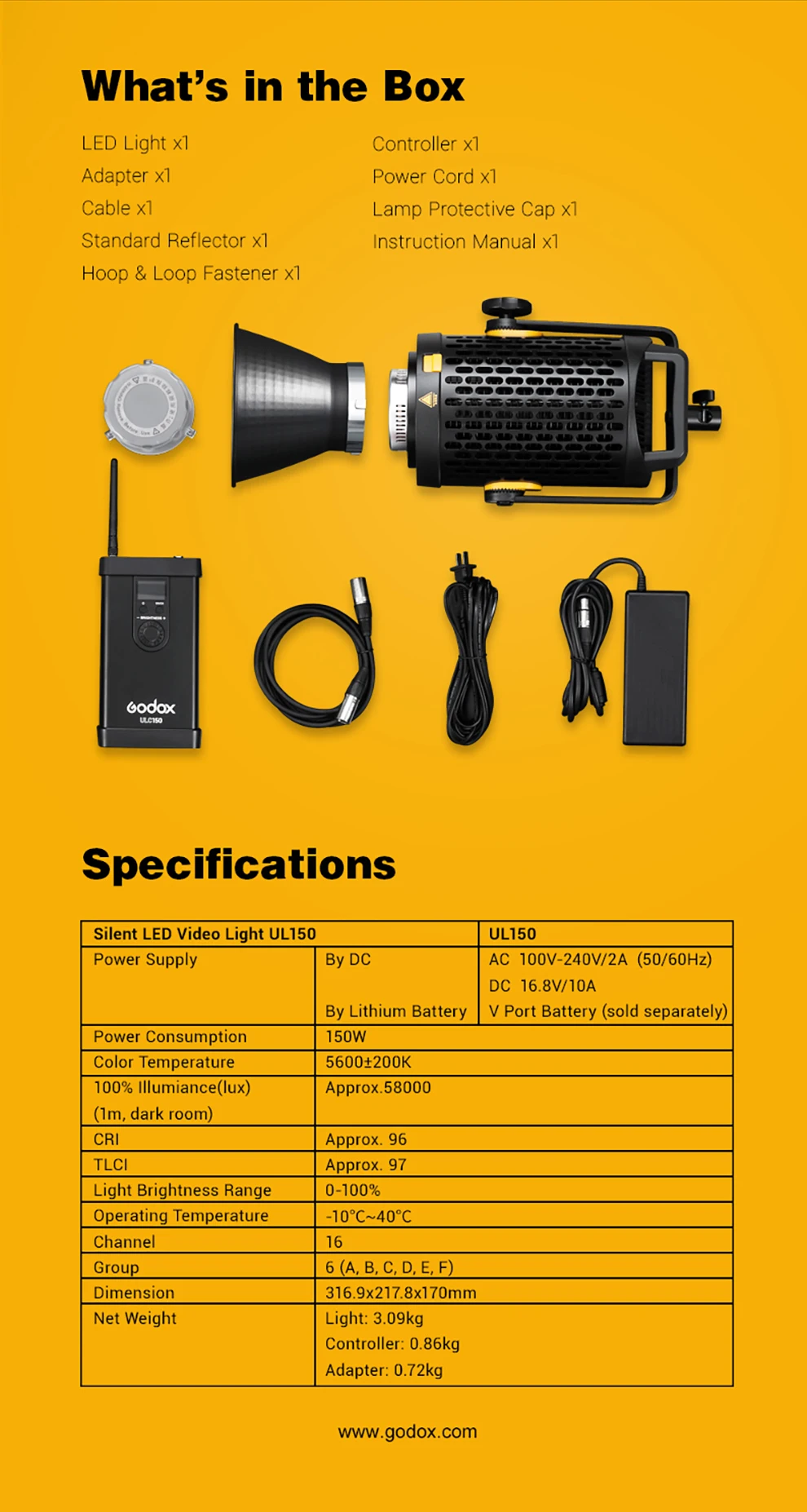 Godox UL150 UL-150, 150 Вт, 5600K, цветовая температура, бесшумный ...