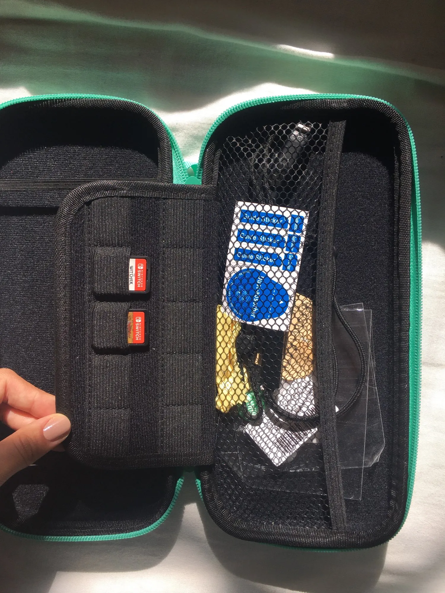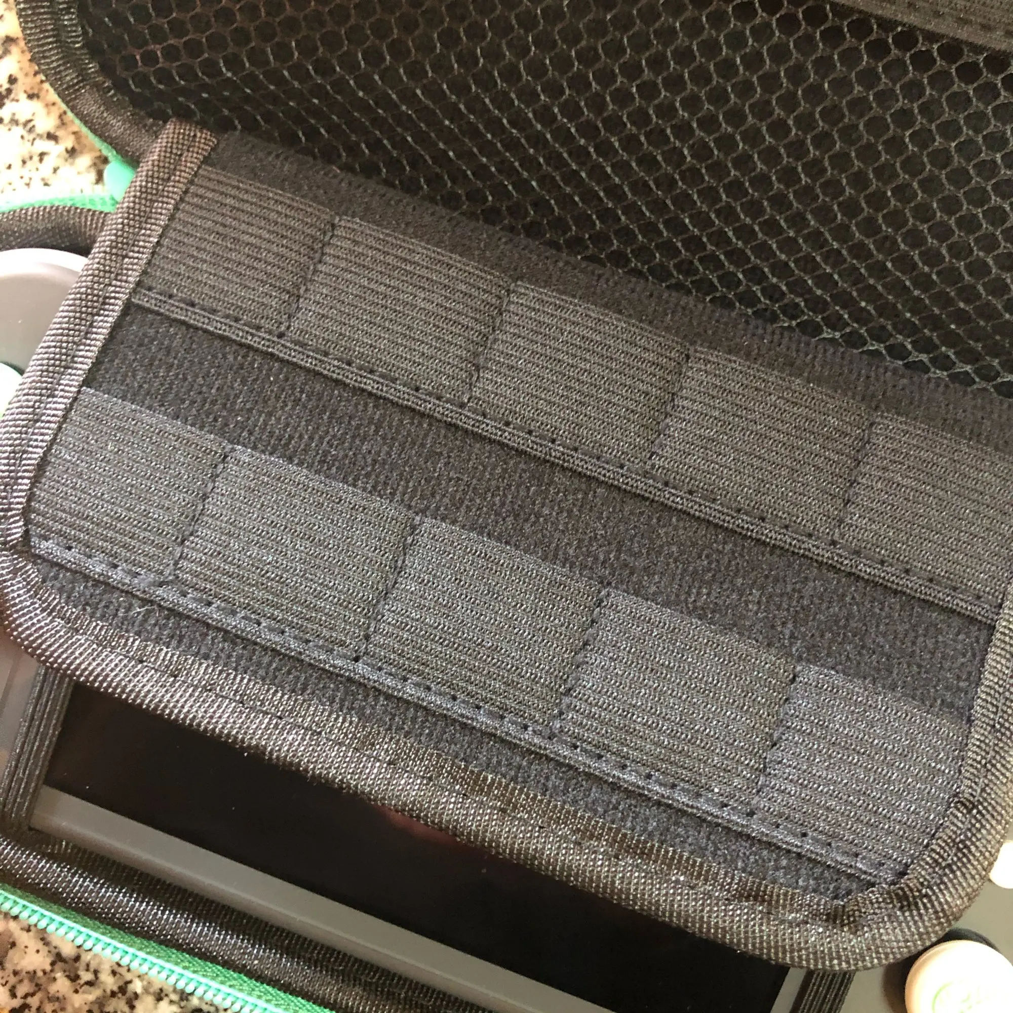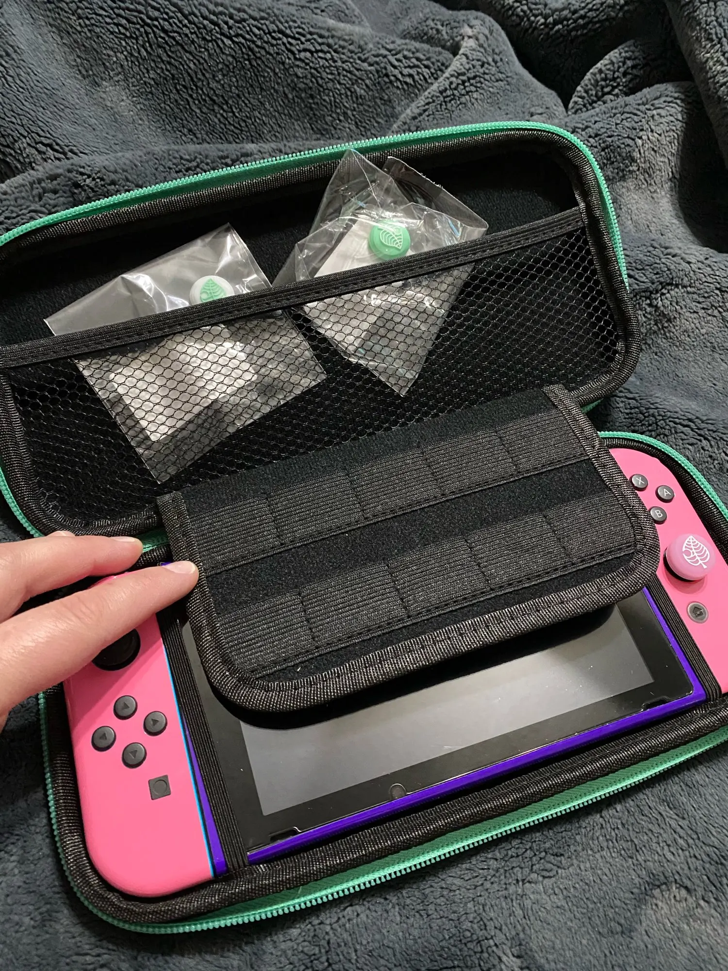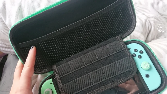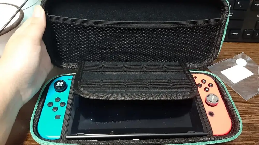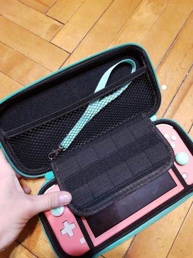 Это довольно сложно на чехле, хорошо защищает nintendo. Если у вас есть пластиковый корпус, он подходит очень хорошо, но подходит. Способ подключить к nintendo подходит для двух резиновых полос, он работает довольно хорошо. Карман внутри очень практичный, вы можете приспосабливать отдельный игровой держатель, кроме того, который включает крышку