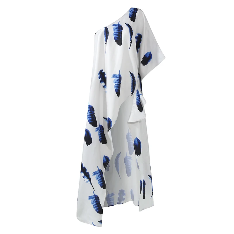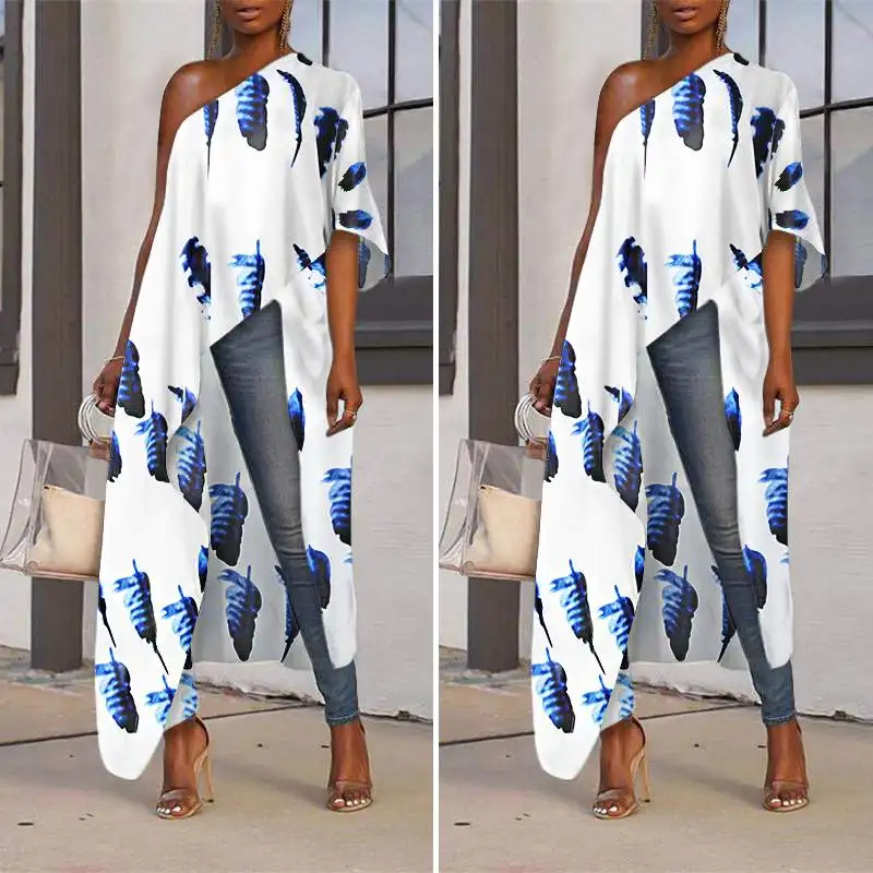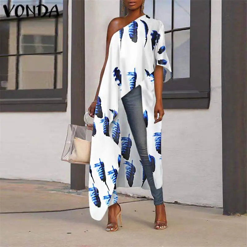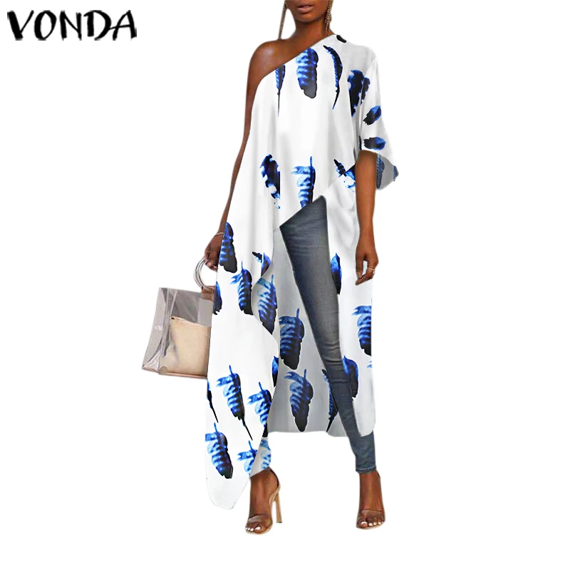 Вечерние чные рубашки 2021 VONDA, Женская Длинная блузка с открытыми плечами, туника с принтом, женские повседневные ассиметричные топы, блузы