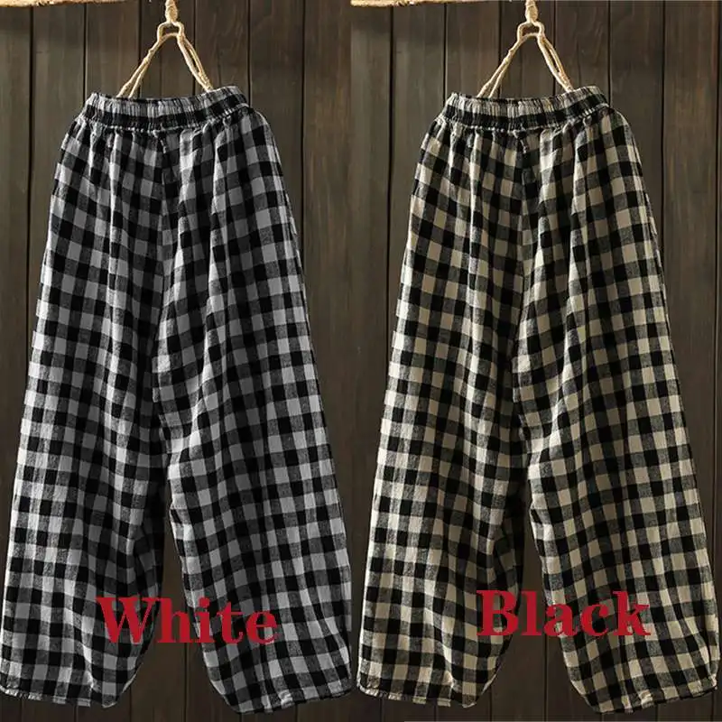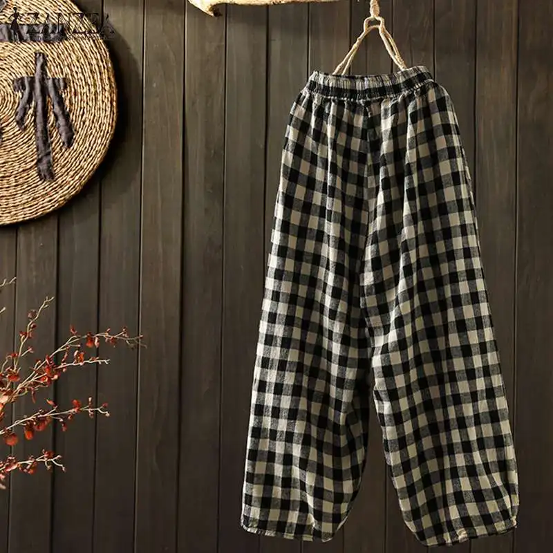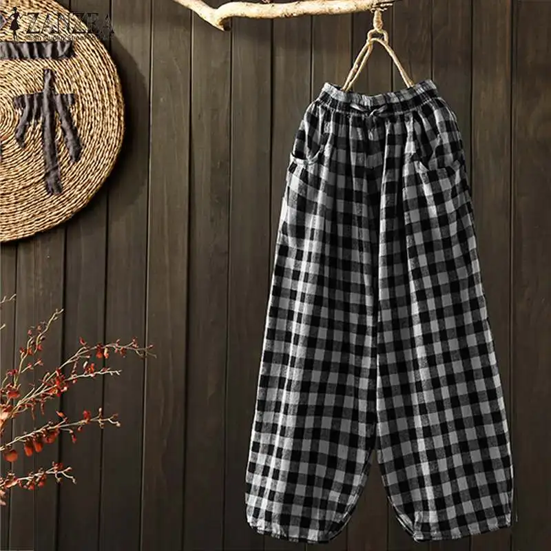 Женские брюки в клетку ZANZEA, модные широкие повседневные штаны с эластичным поясом, палаццо, на шнурке, большие