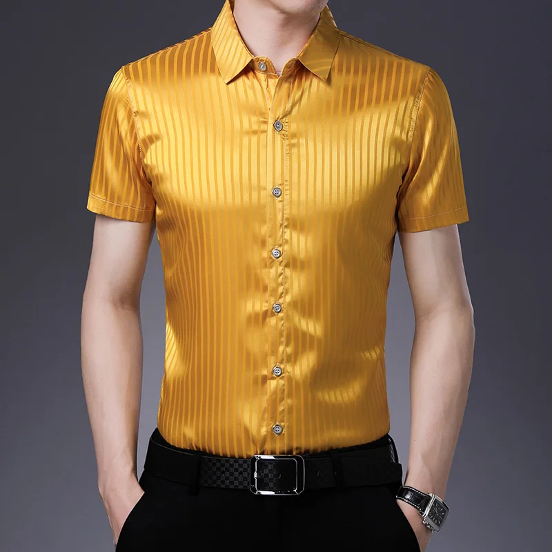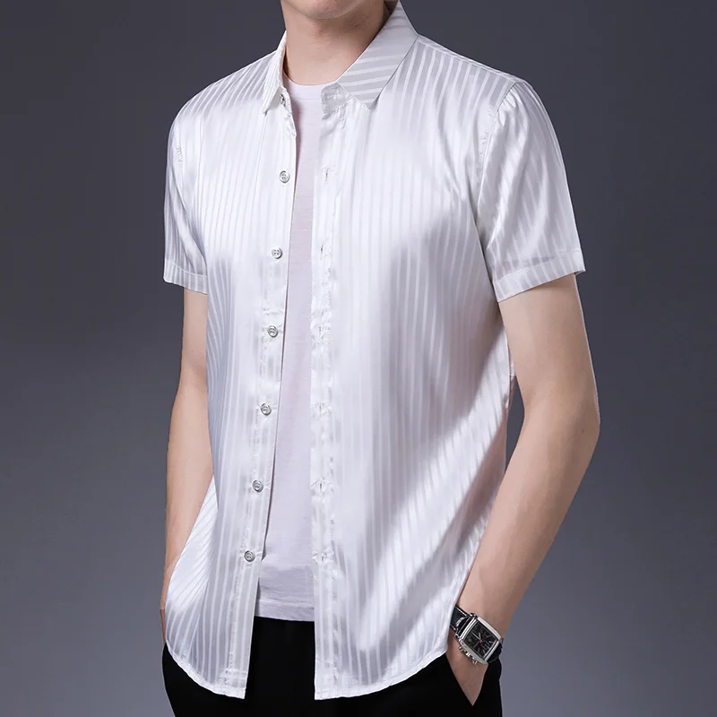 Мужская шелковая рубашка, лето 2020, модная полосатая шелковая одежда, мужская повседневная офисная атласная шелковая Классическая рубашка с коротким рукавом