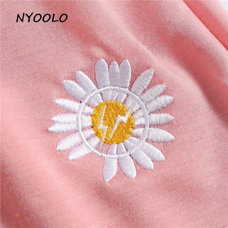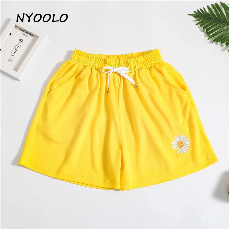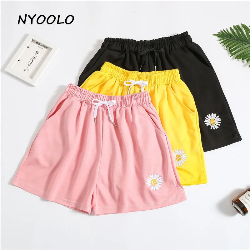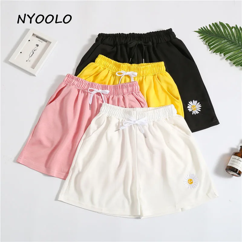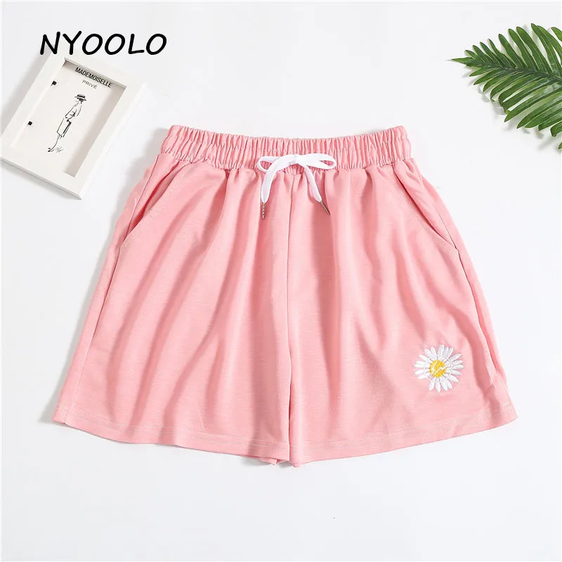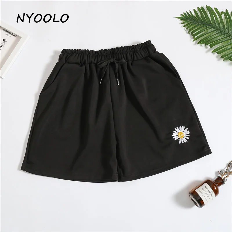 Женские шорты с цветочной вышивкой NYOOLO, летние прямые шорты с эластичной талией, в уличном стиле, в стиле Харадзюку, 2020