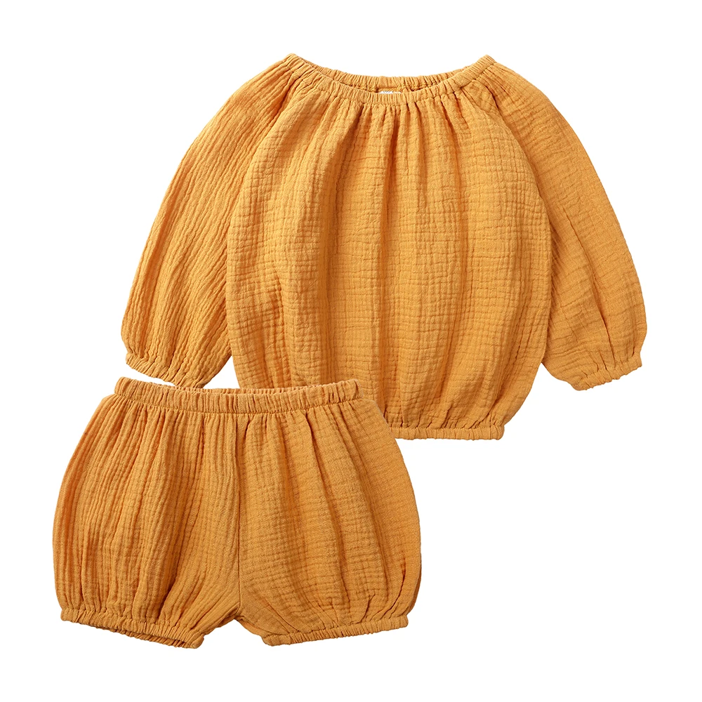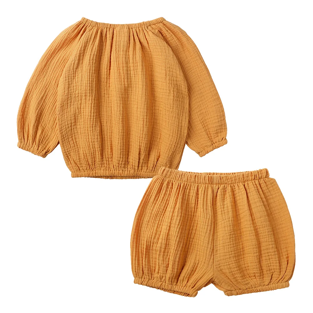 Повседневный комплект одежды для мальчиков, одежда из хлопка и льна для маленьких девочек топы с длинными рукавами + шорты детская одежда на весну и осень