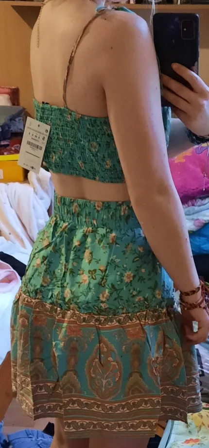 Очень нравится Топ, но юбка имеет облегающий средний шов, это лучший способ для моей области. Заказал L.