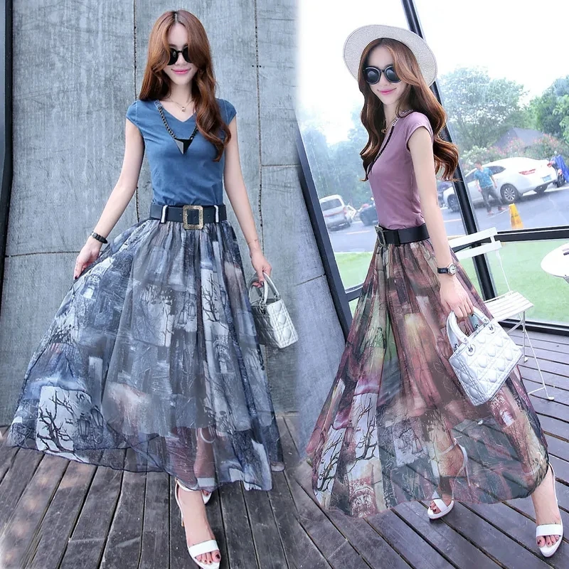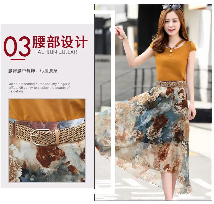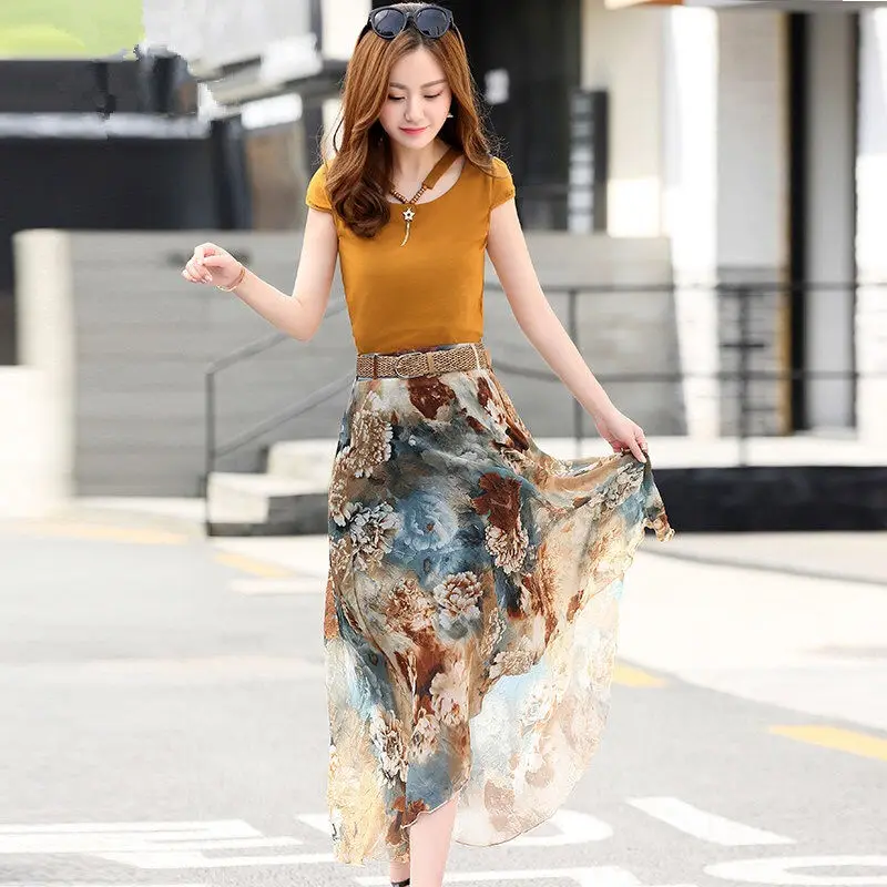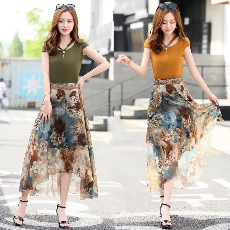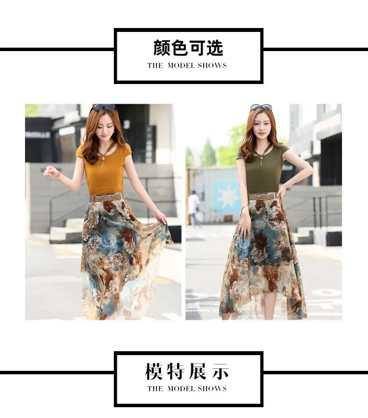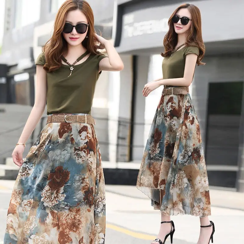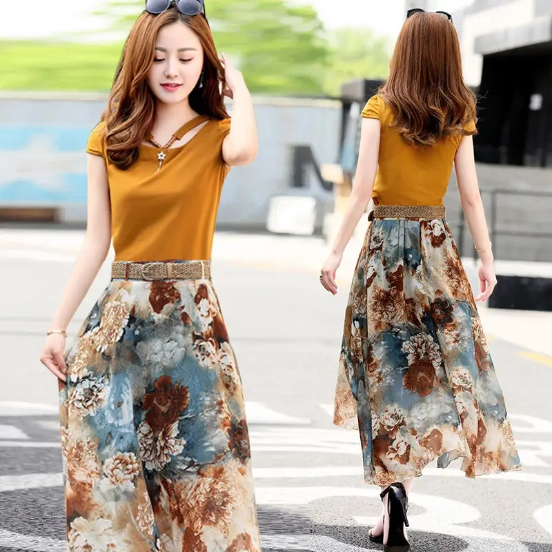 Женский костюм-двойка, футболка и шифоновая юбка, повседневный костюм с круглым вырезом и коротким рукавом, лето 2021