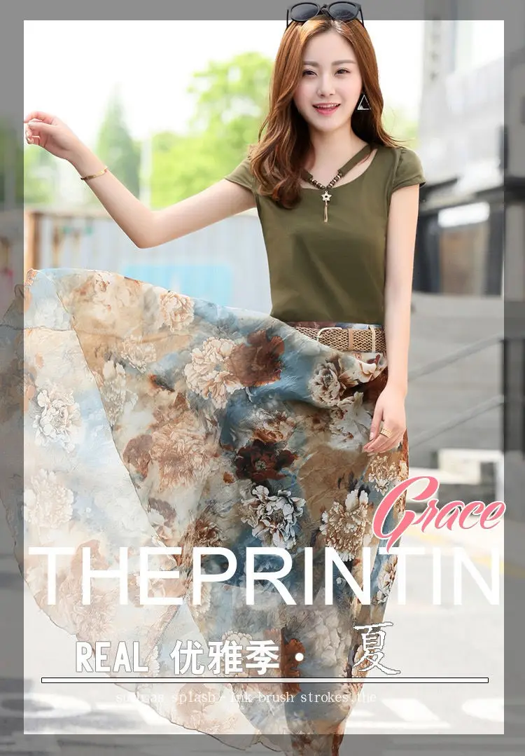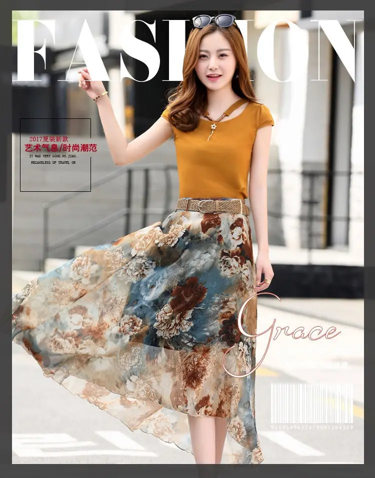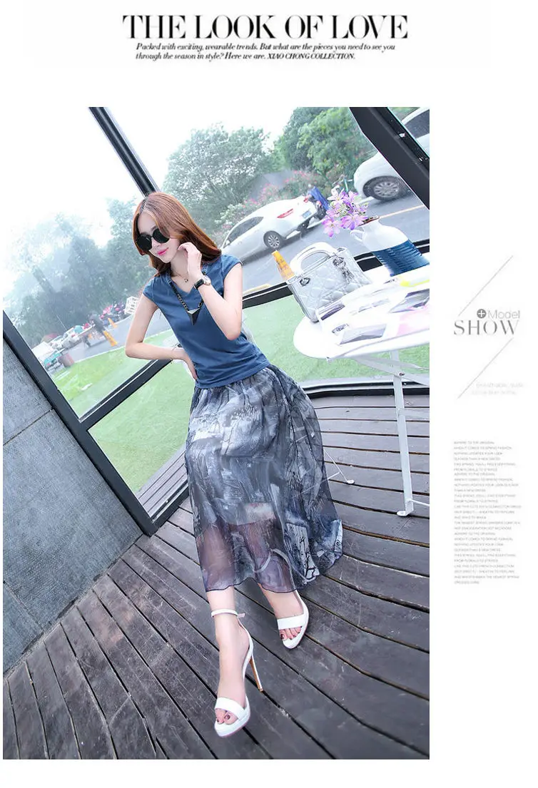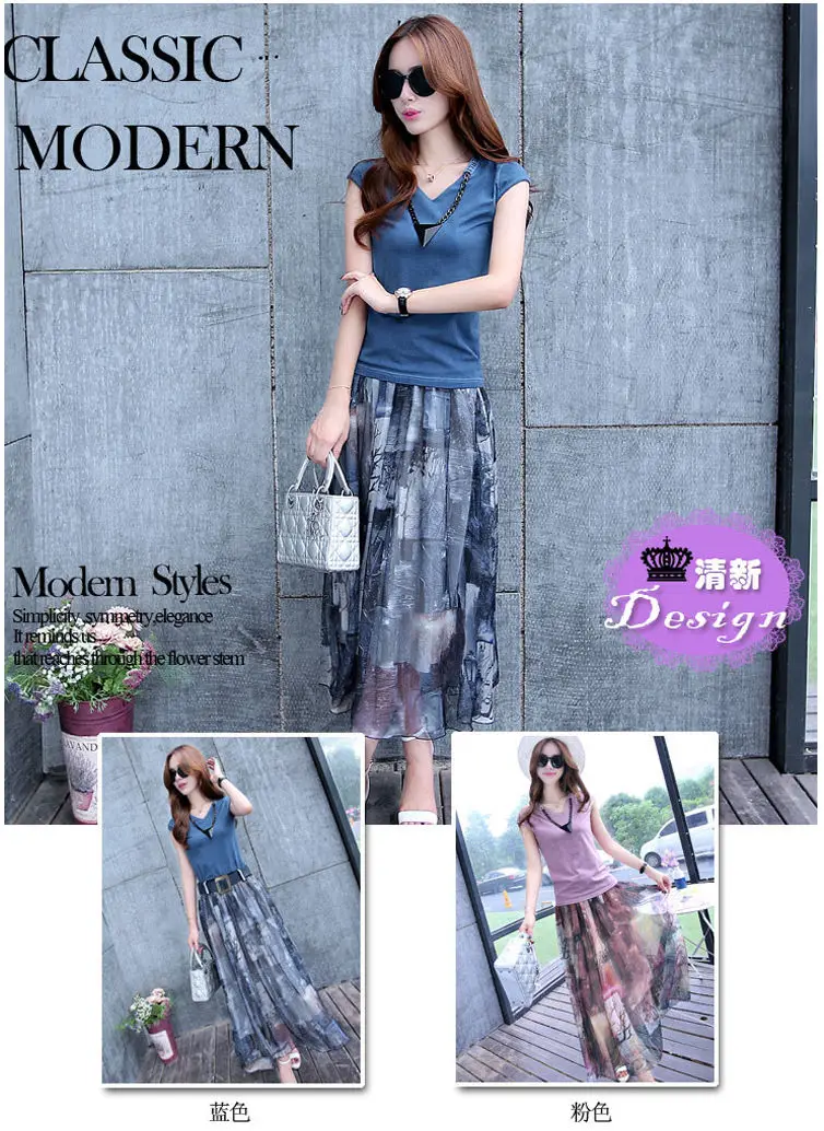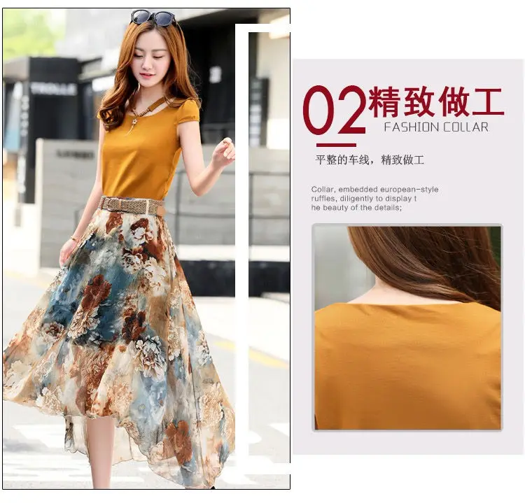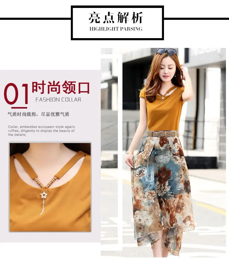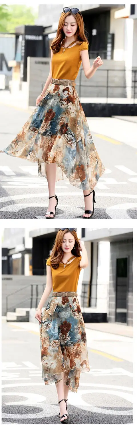 Женский костюм-двойка, футболка и шифоновая юбка, повседневный костюм с круглым вырезом и коротким рукавом, лето 2021