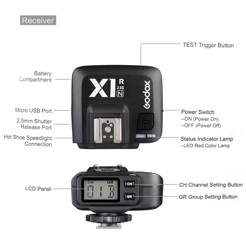 Бренд: Godox Модель: X1R-N Тип: для Nikon Совместимость с: для цифровых зеркальных камер Nikon (i-TTL autoflash); Поддержка всех камер с разъемом для синхронизации ПК Встроенная система дистанционного управления: Беспроводная передача 2,4G Метод модуляции: MSK Источник питания: 2 * батарейки типа АА (не входят в комплект)
