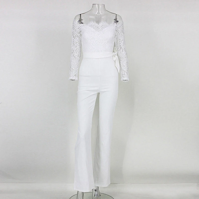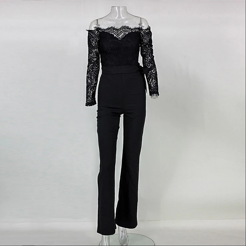 Новые сексуальные комбинезоны с открытыми плечами, элегантные женские кружевные комбинезоны, цельные комбинезоны для женщин, одноцветные повседневные Комбинезоны с поясом, Femme