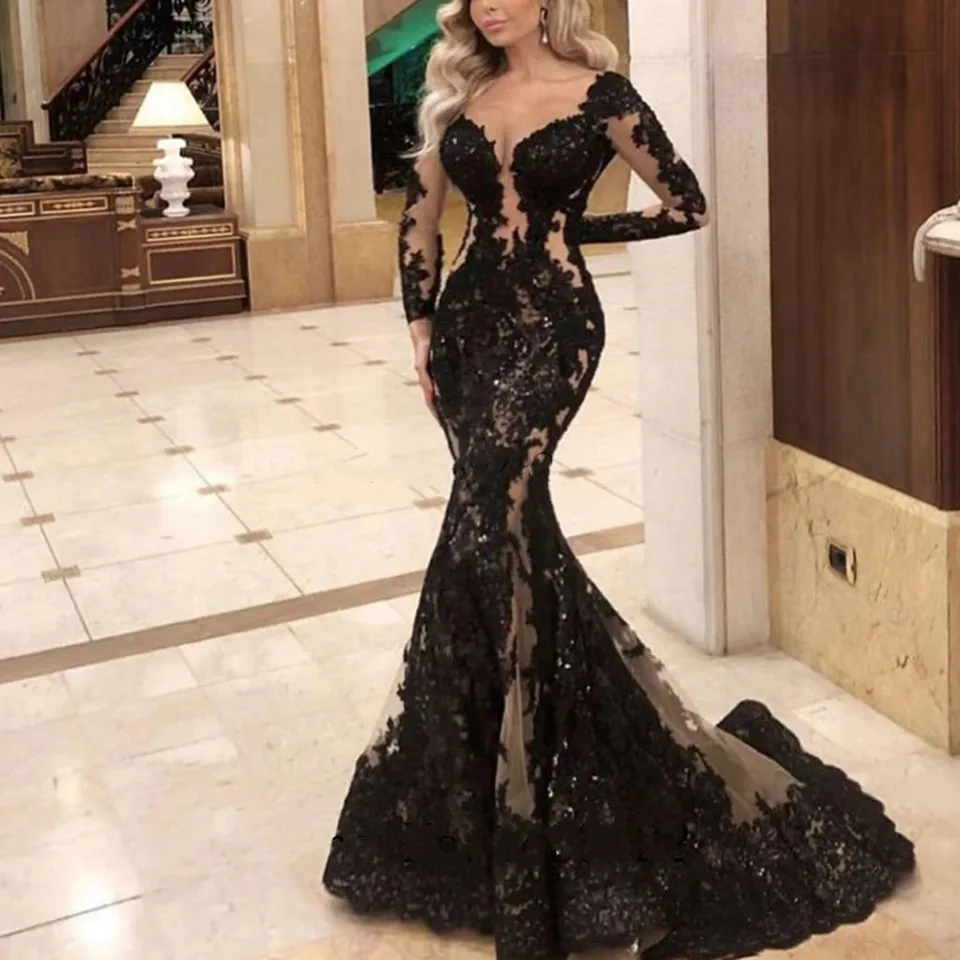 Черные элегантные кружевные вечерние платья 2020, длинные иллюзионн...