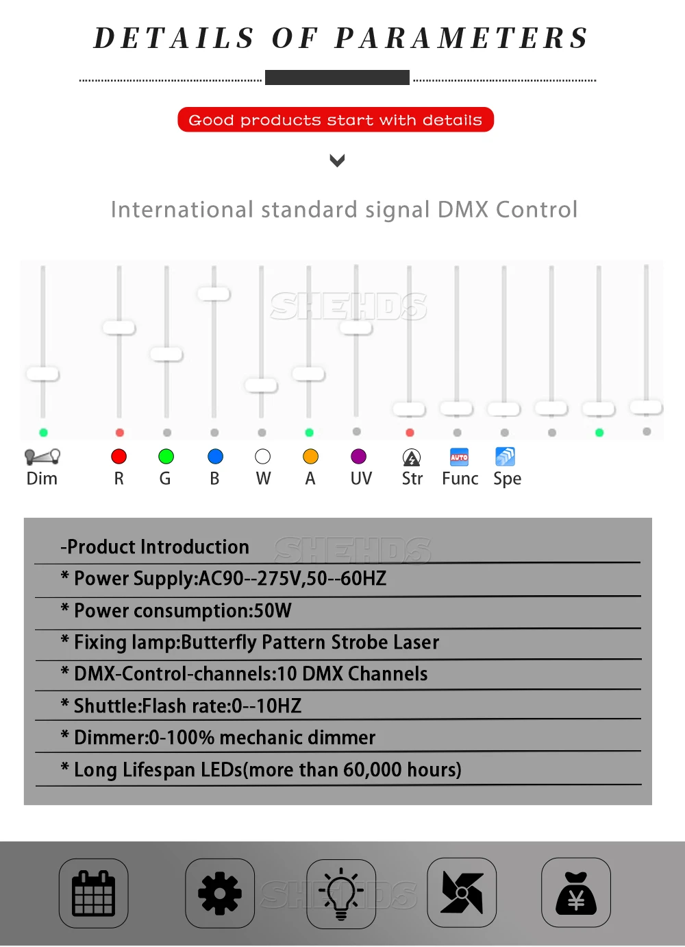 * Питание: AC90--275V,50 -- 60 Гц* Потребляемая мощность: 50 Вт* Крепежная лампа: стробоскопический лазер с рисунком бабочки* DMX-Control-каналы: 10 каналов DMX* Челнок: скорость вспышки: 0-10 Гц* Диммер: 0-100% механический диммер* Длительный срок службы светодиодов (более 60000 часов)