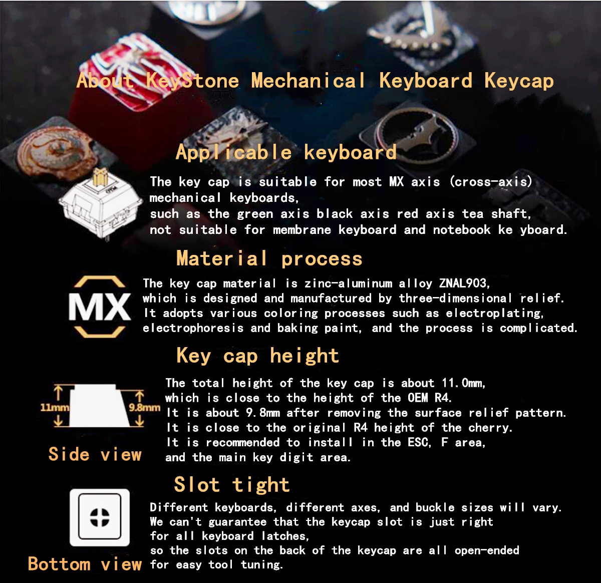 Подходящая клавиатураКолпачок для ключей подходит для большинства MX axis (поперечная ось) механических клавиатур, таких как зеленая ось черная ось красная ось чайный вал, не подходит для мембранной клавиатуры и ноутбука ke yboardПроцесс изготовления материалаМатериал крышки ключа-цинк-алюминиевый сплав ZNAL903, который разработан и изготовлен трехмерным рельефом. Он принимает различные процессы окраски, такие как гальваника, электрофорез и краска для выпечки, и процесс сложный.Высота крышки ключаОбщая высота крышки ключа составляет около 11,0 мм, что близко к высоте OEM R4. Речь идет о 9,8 мм после снятия поверхности рельефного рисунка. Он близок к первоначальному росту вишни R4. Рекомендуется установить в области ESC, F и в области основной ключевой цифры.Плотно прилегающий слотРазличные клавиатуры, разные оси и размеры пряжки будут отличаться. Мы не можем гарантировать, что слот keycap подходит для всех защелок клавиатуры, поэтому слоты на задней панели keycap являются открытыми для легкой настройки инструмента.