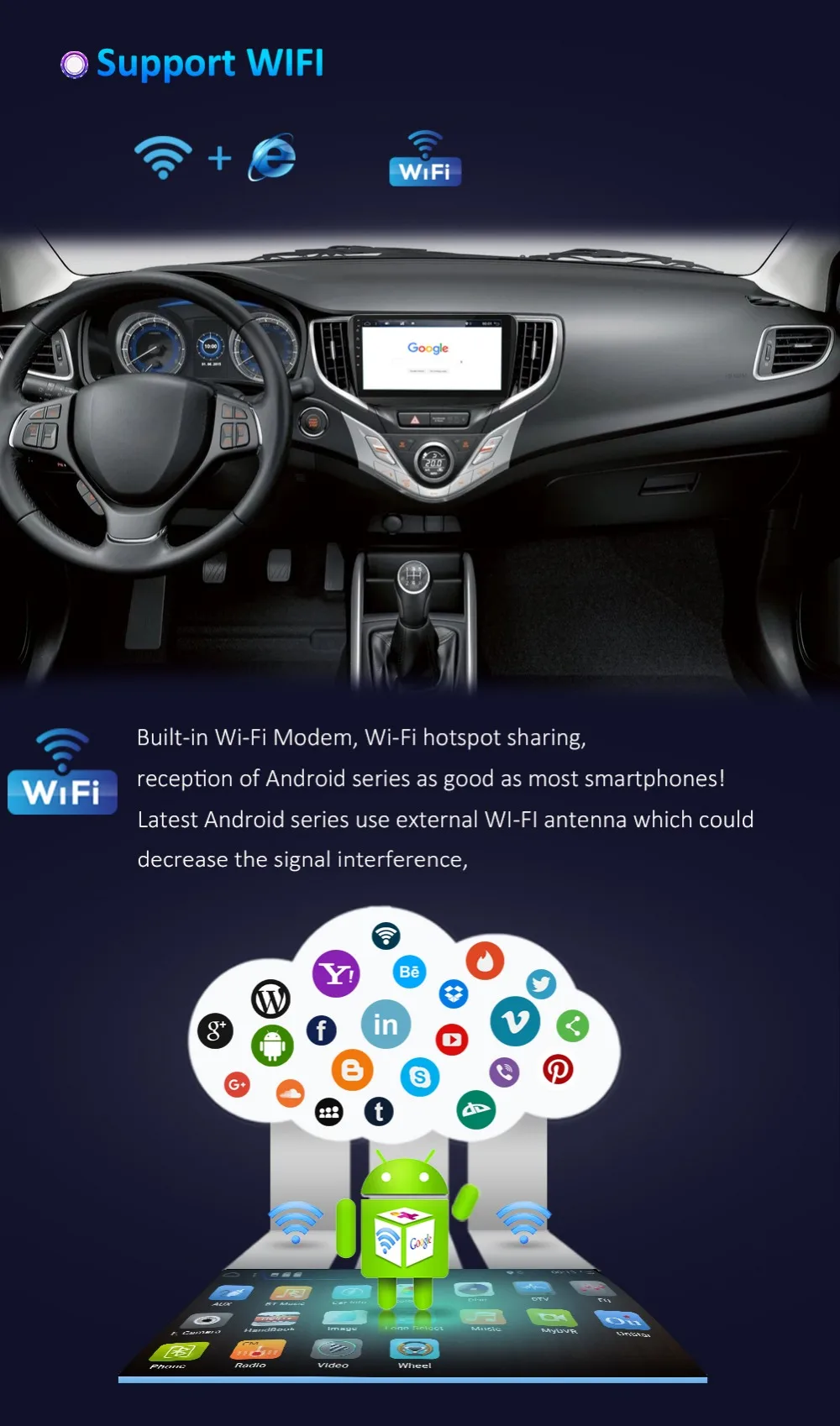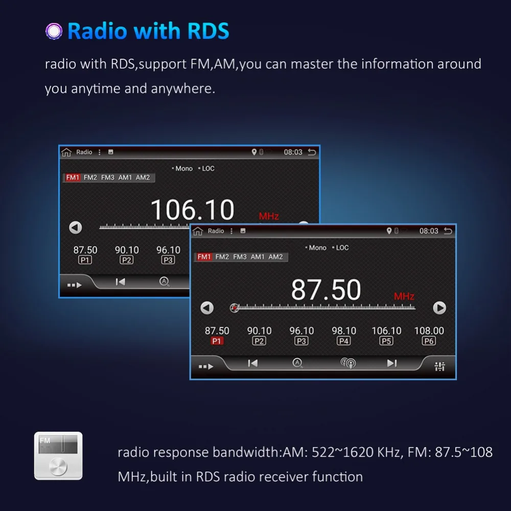 1. Встроенный BluetoothBluetooth с A2DP/Hands Free/Телефонная книгаПоддержка громкой связи BluetoothМузыкальный плеер с BluetoothАвтозагрузка телефонных книг2. Поддержка управления рулевым колесомСовместим с большинством функций управления рулевым колесом.Легко переключать песни, каналы и регулировать громкость, что обеспечивает более безопасное и приятное путешествие.3. Встроенный gps-приемникСовместимость с Waze/Navfree/Google Map и т. д.: с тех пор, пока есть пункт назначения, вы можете пойти куда угодно и никогда больше не заблудиться!4. Многоцветные кнопкиВиды цветных огней панели, ПерсонализацияС вашим любимым цветом5. Настройки эквалайзераБлагодаря встроенному усилению 4*45 Вт музыка звучит очень четко даже на большой громкости.Вы можете настроить звук по собственным предпочтениям с помощью 9-полосного графического эквалайзера: поп, рок, джаз, классика, плоский, пользовательский, голос и т. Д.Несколько вариантов настройки позволят вам лучше наслаждаться звуком.6. Подключение Wi-FiЭто автомобильное gps-радио со встроенным Wi-Fi модулем, онлайн-навигацией, поддержкой онлайн-навигации google maps, простым подключением Wi-Fi/горячей точки вашего телефона, вы можете наслаждаться серфингом в Интернете и загружать понравившиеся приложения из встроенного google play store. В автомобильной стереосистеме dash поддерживает ключ 3G / 4G, но не входит в комплект. Если вам нужно добавить эту функцию, свяжитесь с нами перед заказом.7. МногоязычныйЯзык экранного меню: английский/русский/французский/немецкий/испанский/итальянский/арабский/Португальский/Турецкий/тайский/Польский/иврит и т. д. 71 язык8. Поддержка функции зеркальной связи.Передача информации на экран монитора вашего автомобиля9. Поддержка загрузки приложения Android и магазина Google playВы можете загрузить приложение, которое хотите10. Радио (AM/FM)Диапазон частот AM: 530-1710 кГцЧастотный диапазон FM: 87,5-107,9 МГц11. Поддержка камеры заднего вида (отправка камеры в подарок)Когда автомобиль переключается на заднюю передачу, этот экран автоматически переключается на задний вид с парковочными линиями.12.OBD (опционально)Поддержка бортовой диагностикиКонтролируйте рабочее состояние автомобиляКогда автомобиль переключается на заднюю передачу, этот экран автоматически переключается на задний вид с парковочными линиями.13.DAB + (необязательно)Цифровое аудиовещание имеет стабильность сигнала иКачество звука на уровне CD14. Поддержка CarPlay/Android auto (опционально)Этот DVD оснащен USB-разъемом, который поддерживает подключение к вашему телефону, прост в управлении и обращении с Iphone через устройство.15. Поддержка USB TPMS (необходимо купить TPMS у нас и downlaod apk)Отображает давление и температуру 4 шин в режиме реального времени.Как только давление или температура в шине будут нестандартными, немедленно появится сигнал тревоги.