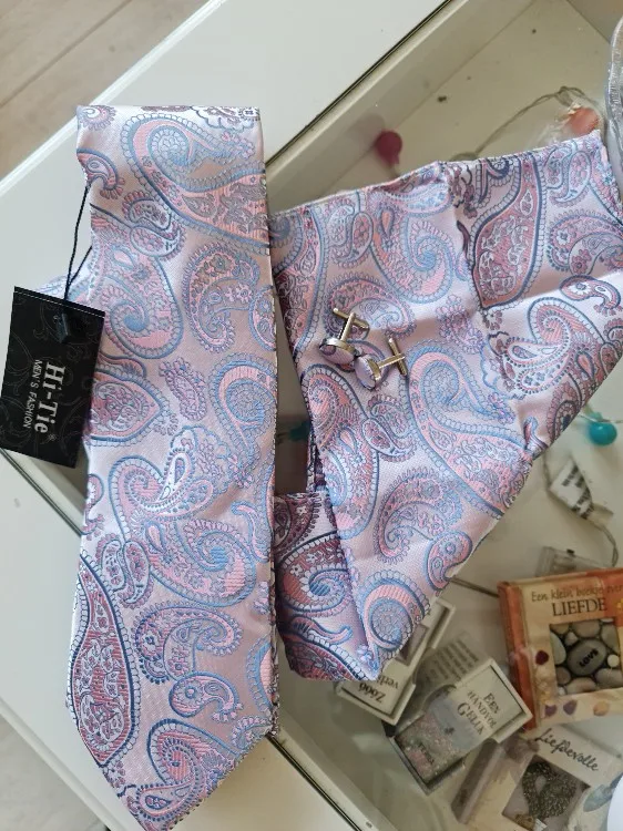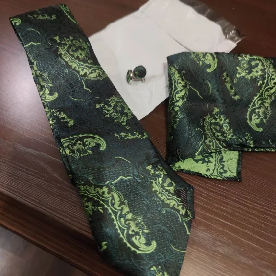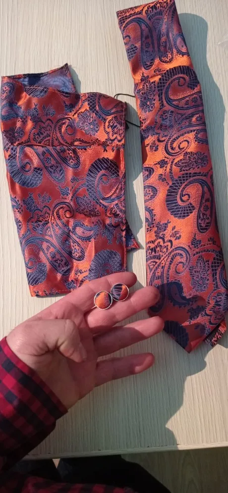 Этот галстук выглядит так же, как на картинке. Высокое качество, очень красивая ткань и дизайн. Получил это в подарок для моего hubby, и ему понравилось! Я не очень внимательно прочла Описание, поэтому не догадывалась, что галстук идет вместе с косынкой и запонами-очень хороший плюс! Супер быстрая доставка, менее 2 недель.