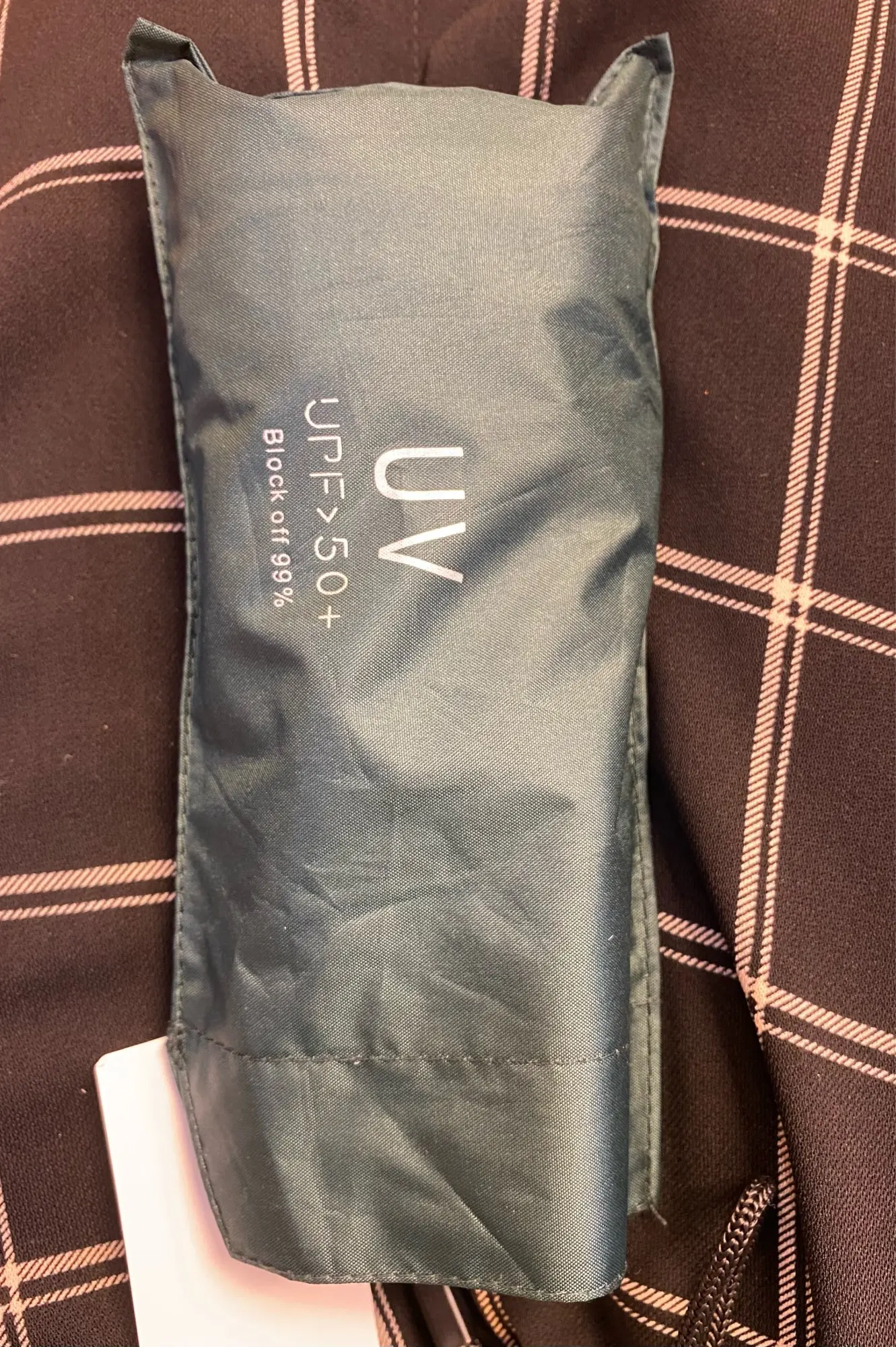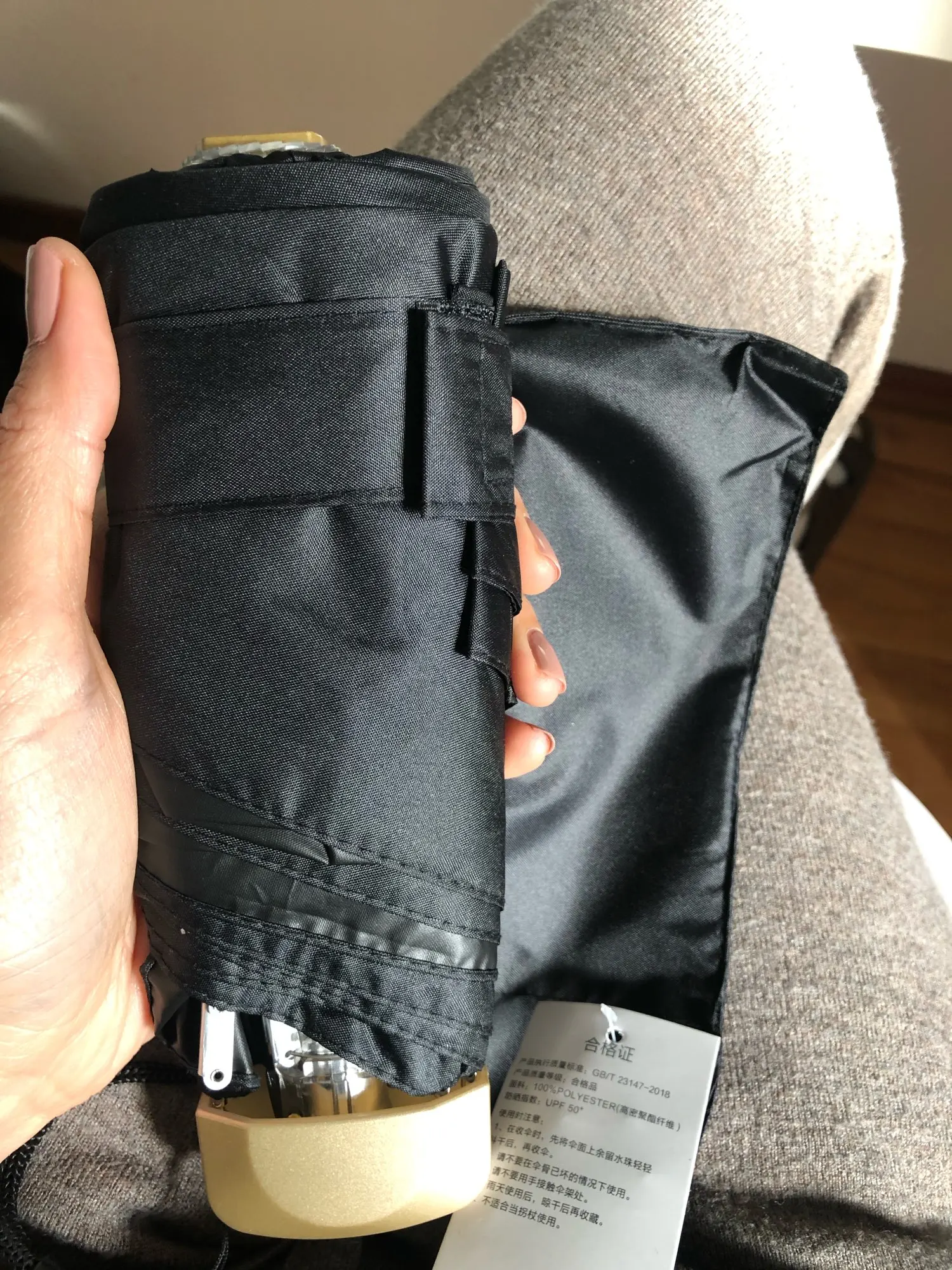 Супербыстрая доставка (в 5-ку). Давно хотела такой маленький механический зонтик. В чехол убирается легко. Я довольна.