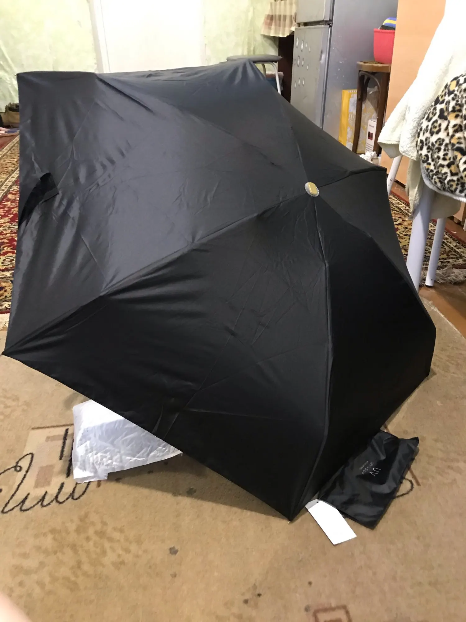 Симпатичный, очень компактный и лёгкий зонтик. Он, конечно, не на каждый день, а если нежданно-негаданно дождь застал в дороге. Помещается во внутренний карман куртки. Аккуратно сложить обратно на улице не выйдет, но запихнуть обратно в чехол получится. Определенно стоит своих денег