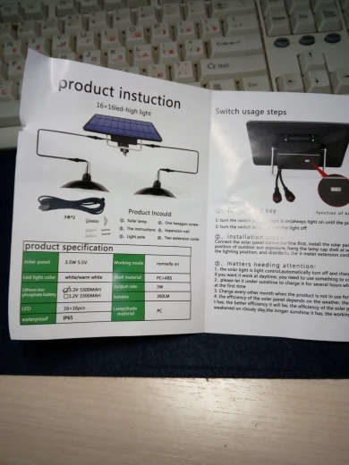 Мастерство очень эстетично. Отсутствует только уплотнение между корпусной батареей и обратной солнечной панелью. 1 аккумулятор 5500 мАч 3,2 в может быть заменен на год или 2 года. Когда wlacznika загорается автоматически с низким naslonecznieniu. 2 пульта дистанционного управления позволяют использовать только или включать свет, если система (датчик освещенности) обеспечивает более продолжительное освещение. Суммируйте свет, не ложились, не остановились только после заката. Товары в порядке. Рекомендую. :)