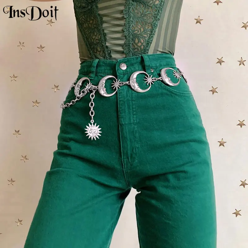 Ремень InsDoit с цепочкой в стиле Харадзюку, винтажный пояс с цепочкой в стиле панк-рок, подвески в виде солнца, цвет серебристый