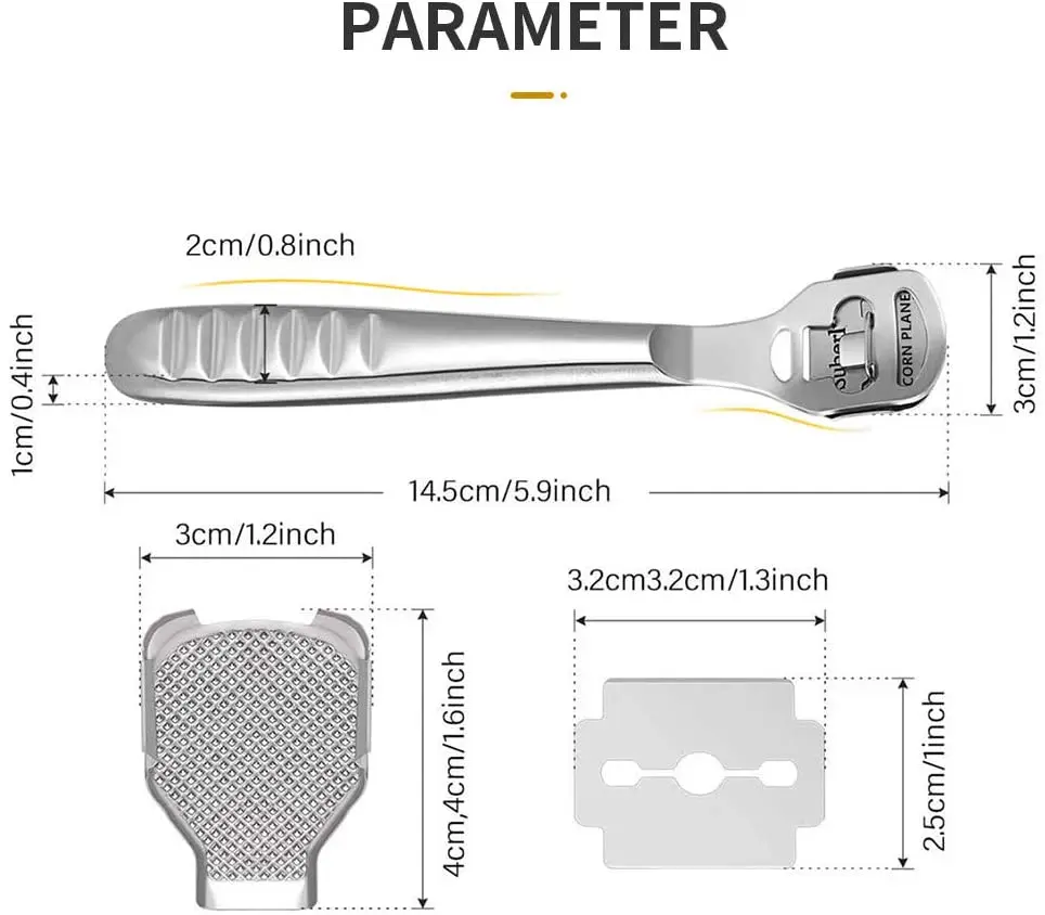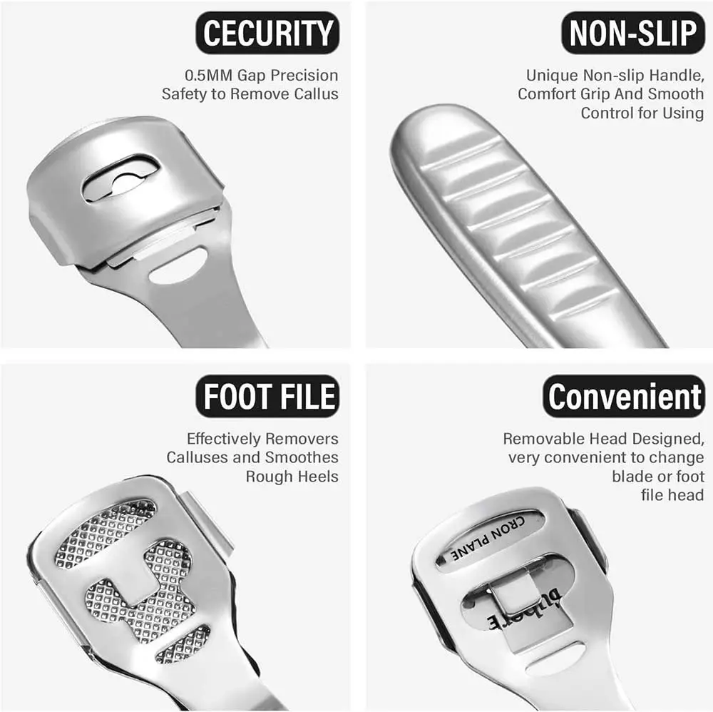 1. Профессиональный инструмент для педикюра изготовлен из полированной нержавеющей стали, не ржавеет, не деформируется. Уникальная Нескользящая ручка, удобный захват и плавный контроль за использованием, чтобы обеспечить вам деликатный и салонный Уход за ногами.2. Устройство для удаления мозолей оснащено портативным корпусом из нержавеющей стали, что позволяет ухаживать за ногами или руками в любом месте в любое время, например в путешествии или командировке, даже в повседневное рабочее время. Используйте его для ухода за ногами и руками в домашних условиях с комфортом в любое время!3. Бритва для мозолей разработана со съемной головкой, очень удобно менять лезвие или загружать напильник. Очень удобно заменить многоразовый чехол для лезвия и пилки для ног после того, как лезвие станет тусклым. Поставляется с 10 сменными лезвиями и 1 шлифовальной головкой для ног для длительного использования.4. Профессиональный педикюрный уход для ног прост в использовании для педикюра, бритвы из кукурузы, жесткой омертвевшей кожи, скребка для пяток и мозолей и т. д., омолаживает гладкую кожу ног и рук, не стесняйтесь за свои ноги! Это хороший подарок для пожилых женщин, мужчин или любителей бегунов!