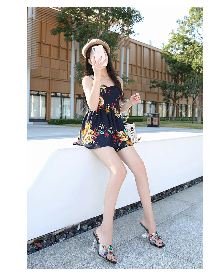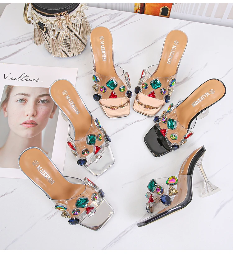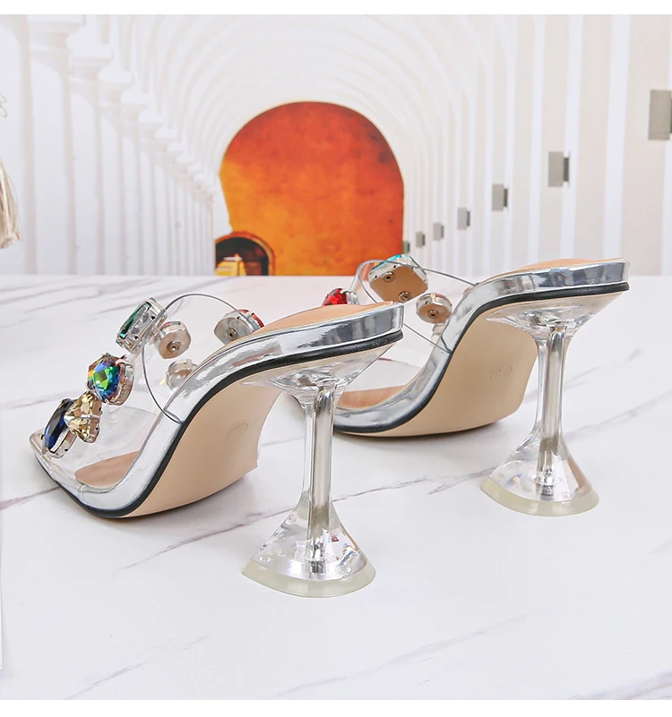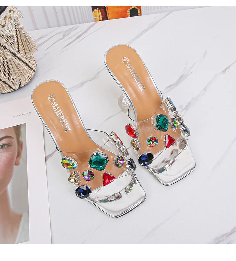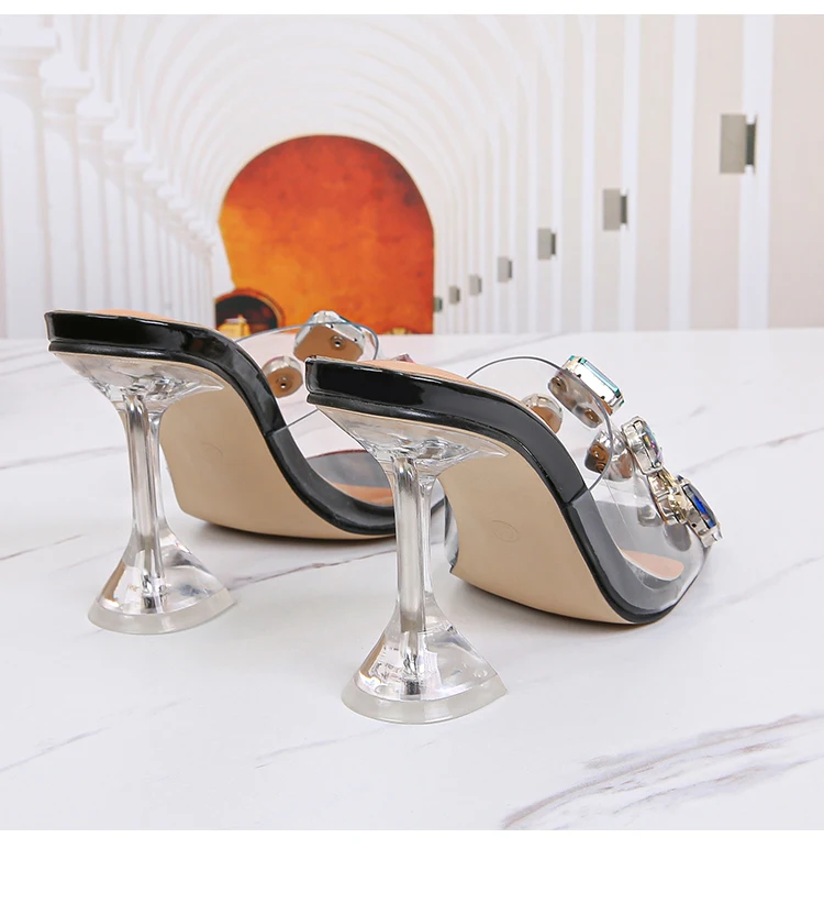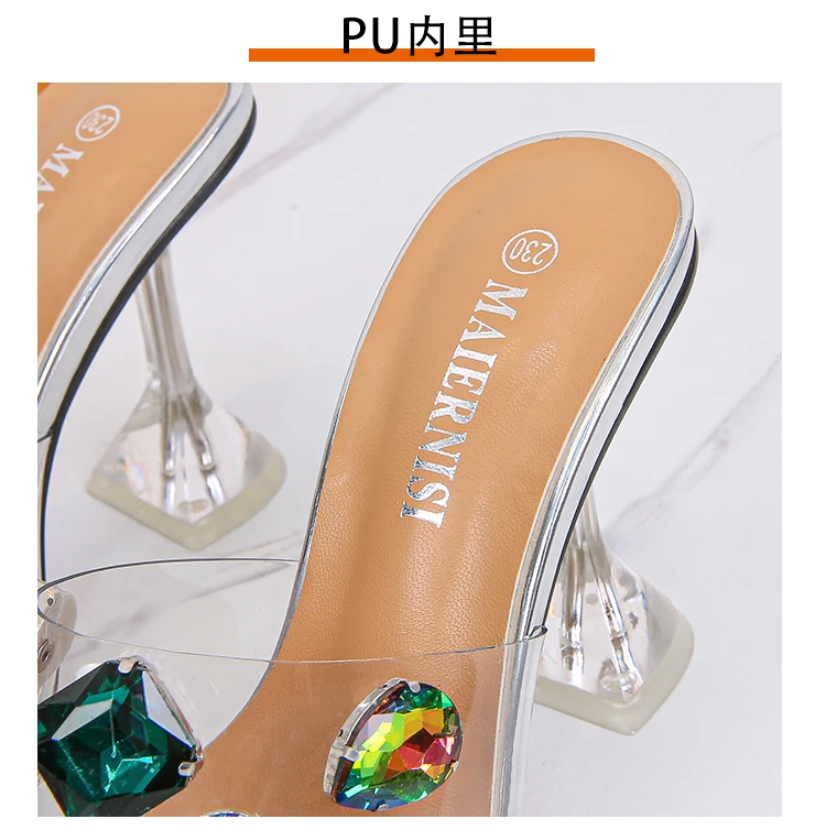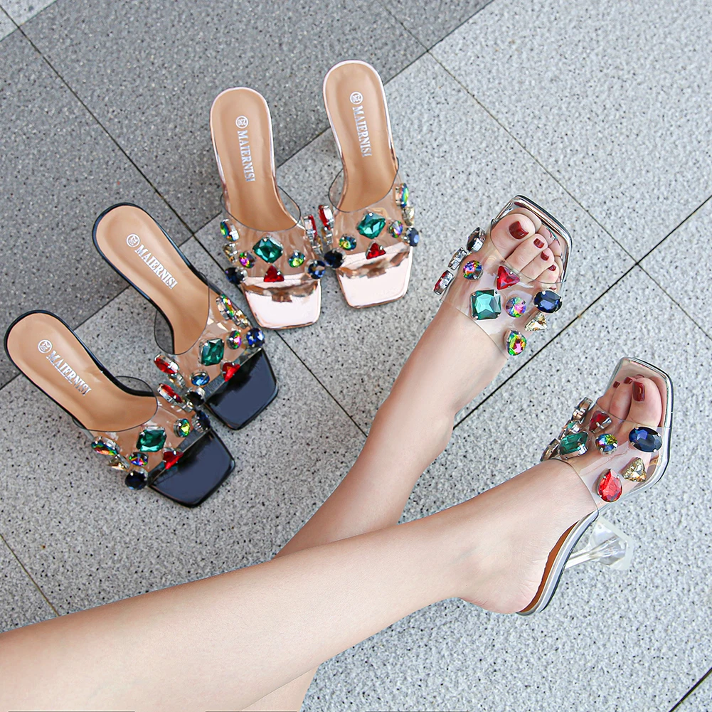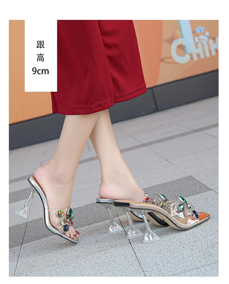 Летние женские шлепанцы; Прозрачные шлепанцы со стразами; Блестящие женские шлепанцы с кристаллами; Босоножки на высоком каблуке 9 см для свадебной вечеринки