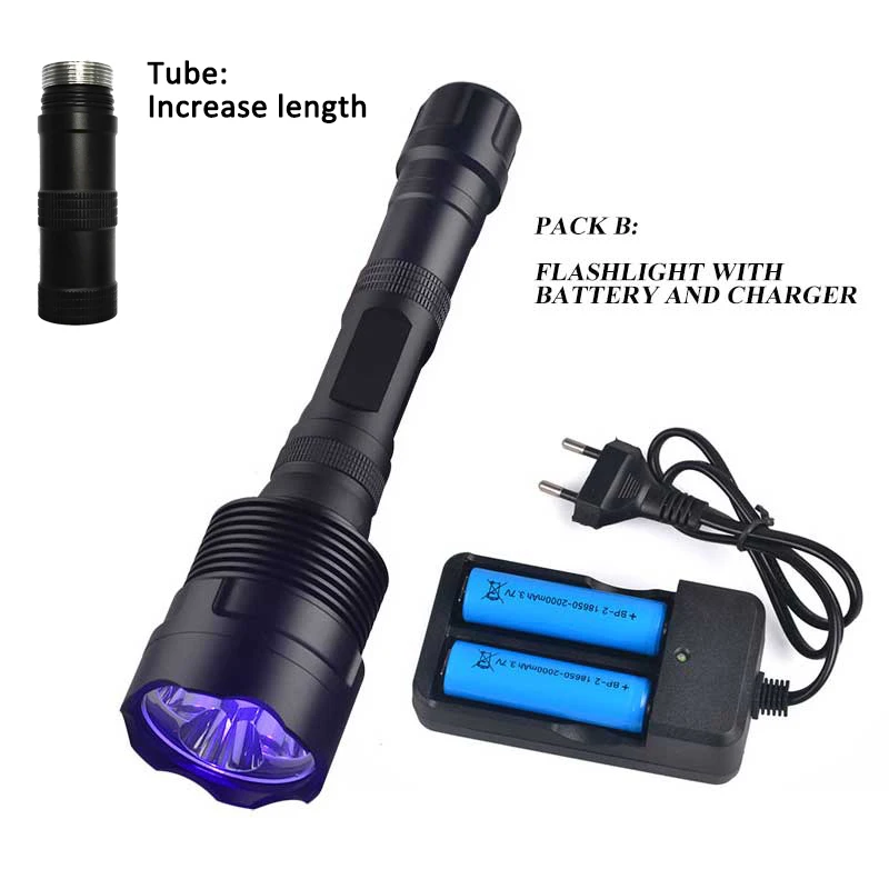 3LED супер мощность УФ 365нм или 395нмИспользуйте батарею 2-18650, пожалуйста, убедитесь, что используется качественный аккумулятор с защитой395nm светильник хорошо подходит для охоты на скорпионов, мочи домашних животных, обнаружения грызунов, флуоресцентного детектора, поиска янтаря, поиска грибов и т. Д.365nm светильник делает вещи лучше видимымиНомер товара: