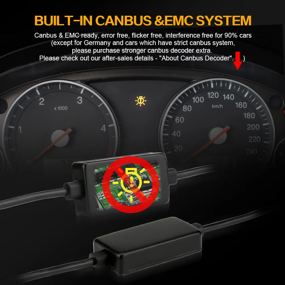 Oridinary Canbus & EMC ready, без ошибок, без мерцания, для 90% автомобилей (за исключением Германии и некоторых японских автомобилей, которые имеют строгую систему canbus) пожалуйста, не открывайте спор, если ваш автомобиль вызывает ошибки или мерцание или не может светильник, пожалуйста, свяжитесь с нашим клиентом.