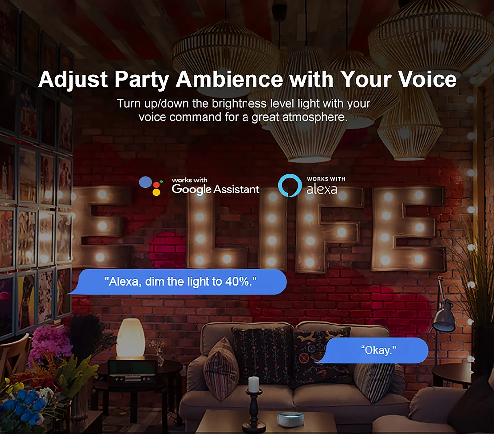 Поверните вверх/вниз светильник уровня яркости с вашей голосовой командой для отличной атмосферы