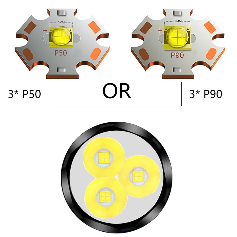 Модель: T3UМатериал: алюминиевый сплавМодель лампы: 3 * XHP50.2 / XHP90.2Режим освещения: высокий/низкий/SOSМетод зарядки: микро USB зарядкаБатарея: 26650 перезаряжаемая батарея