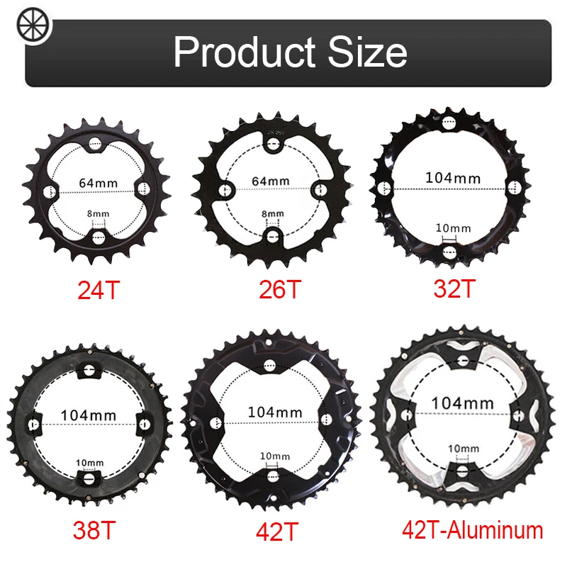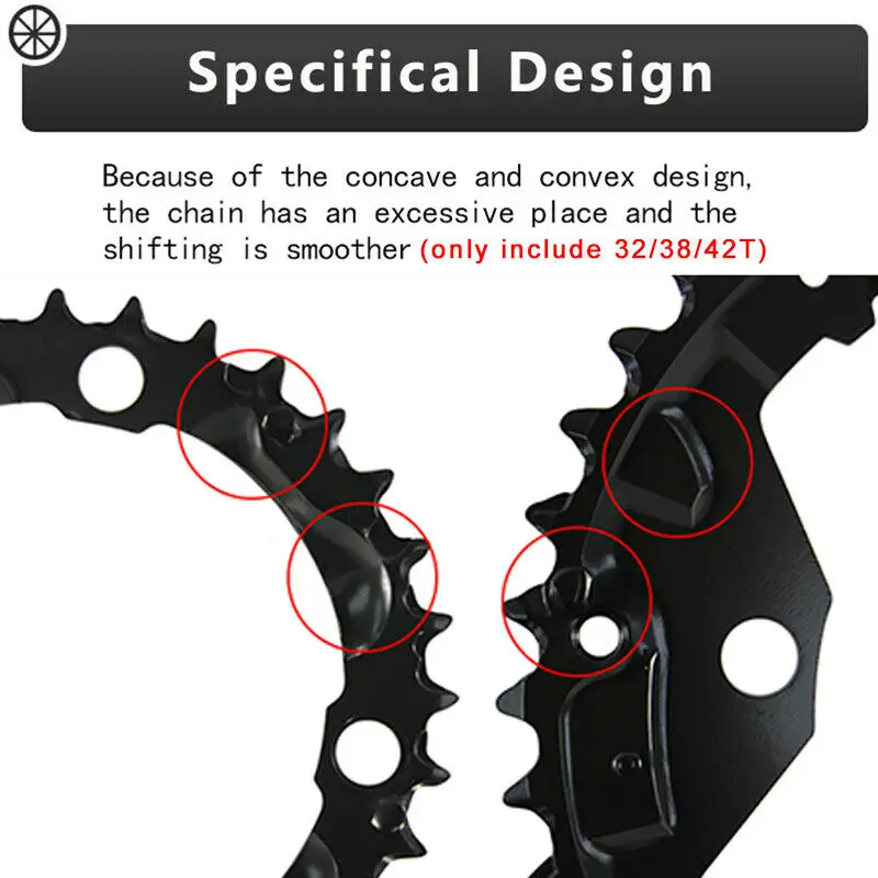 Зубы: 24/26/32/38/42 т Скорость: 3x10S,2X10S Материал: сталь (24/26/32/42/T), сталь + нейлон (38T), алюминий (42T) BCD: 104 мм (32/38/42T),64 мм (24/26T)Ось: BB24 кованые CrMo Особенность (включает в себя только 32/38/42 т): Специальные профили зубов дизайн приводит к цепи оставить цепное кольцо легче, когда происходит переменная скорость. Во-вторых, из-за вогнутой и выпуклой конструкции, цепь имеет чрезмерное место, поэтому скорость езды может быть более гладкой.
