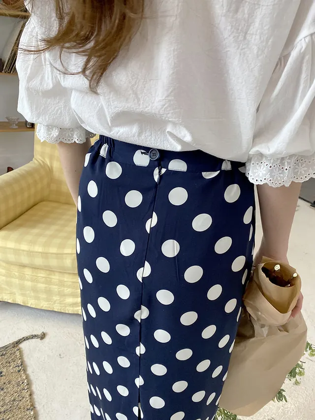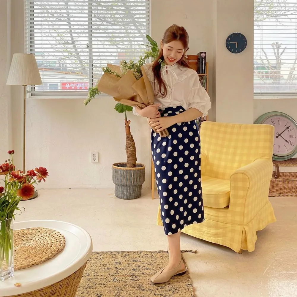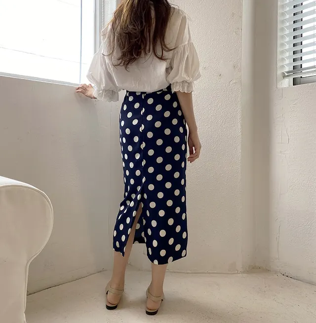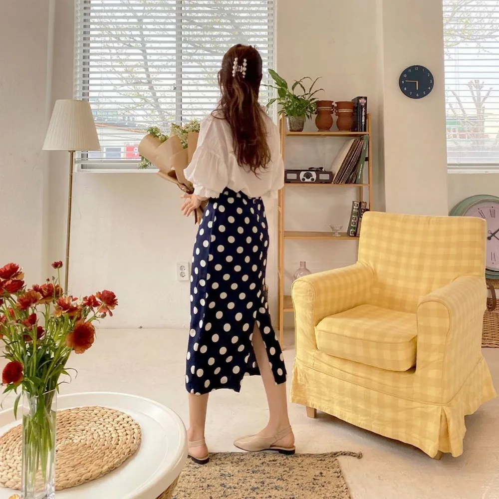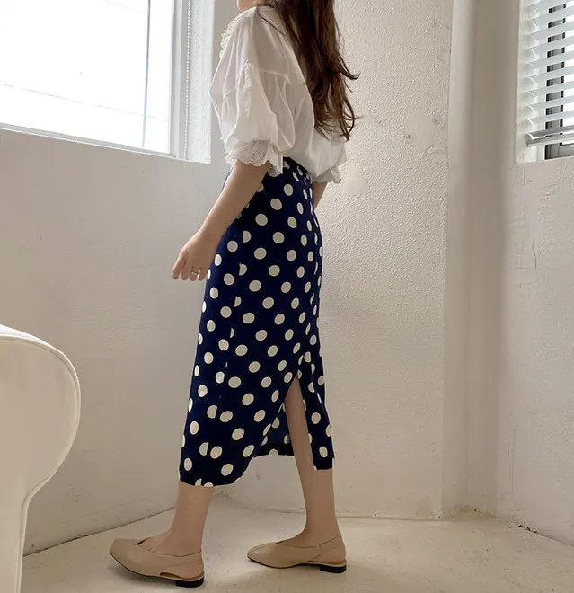 Женская длинная юбка-карандаш с запахом, летняя синяя юбка в горошек с высокой талией и разрезом на подоле