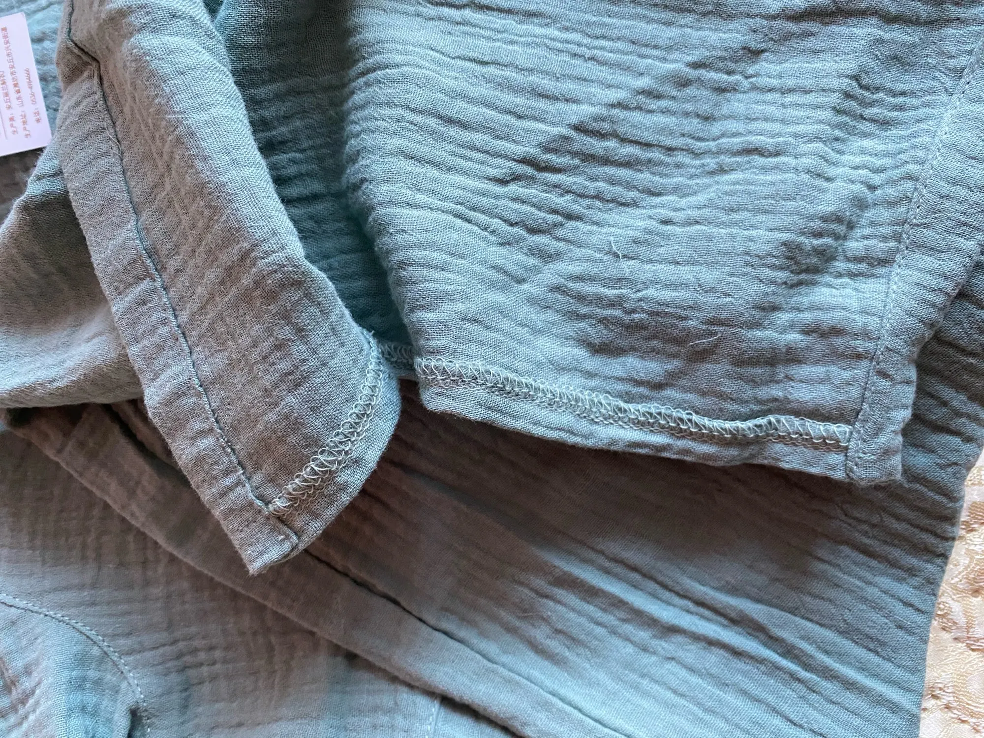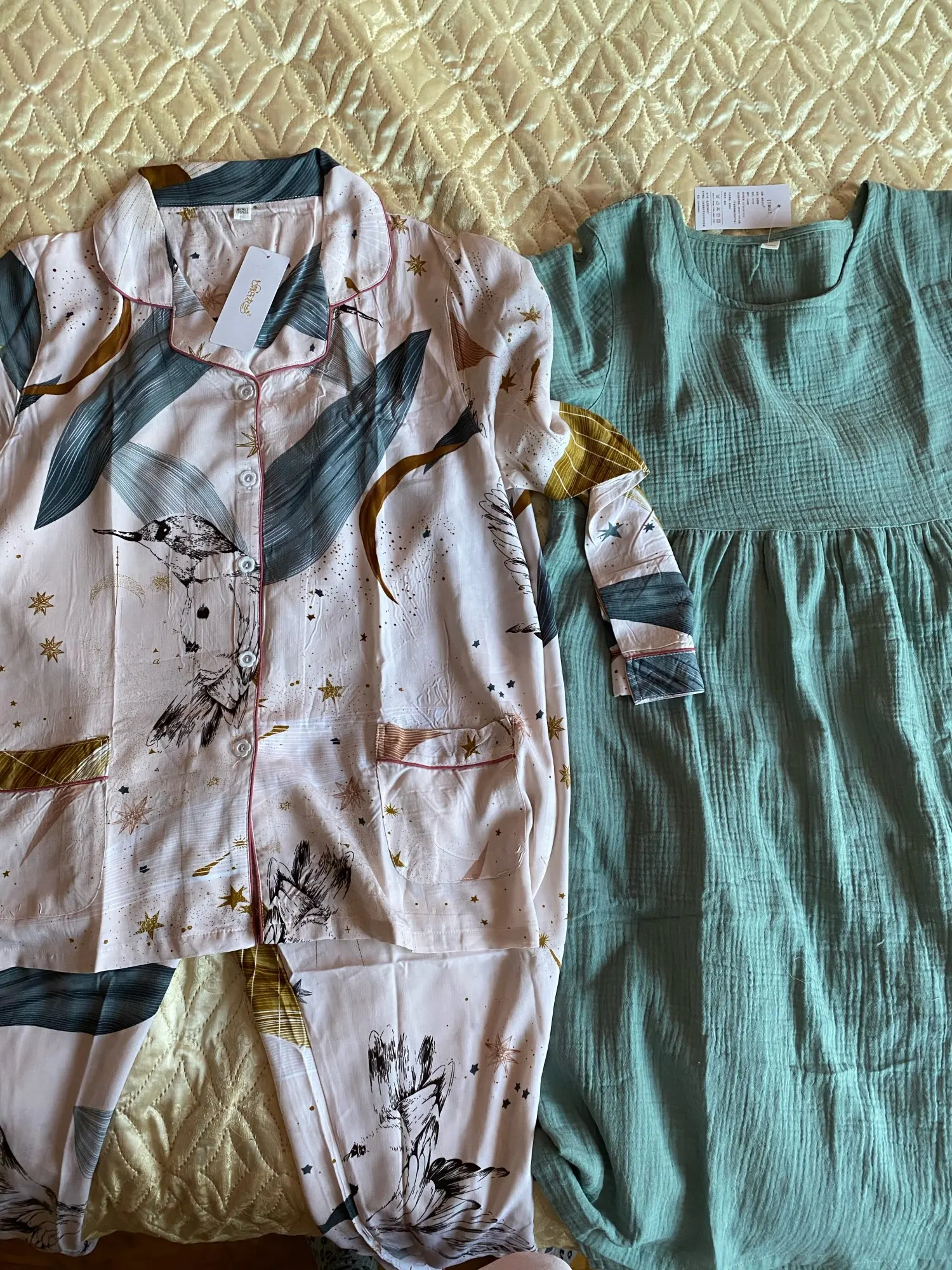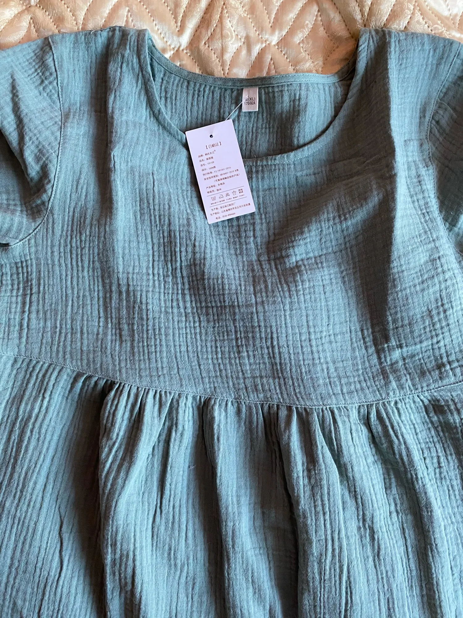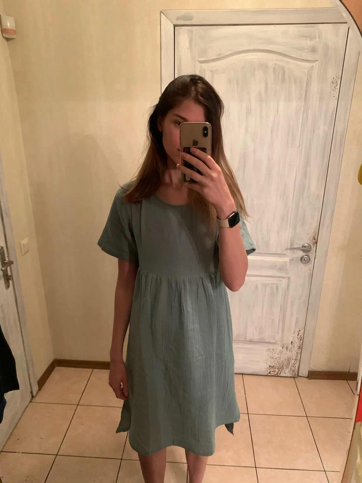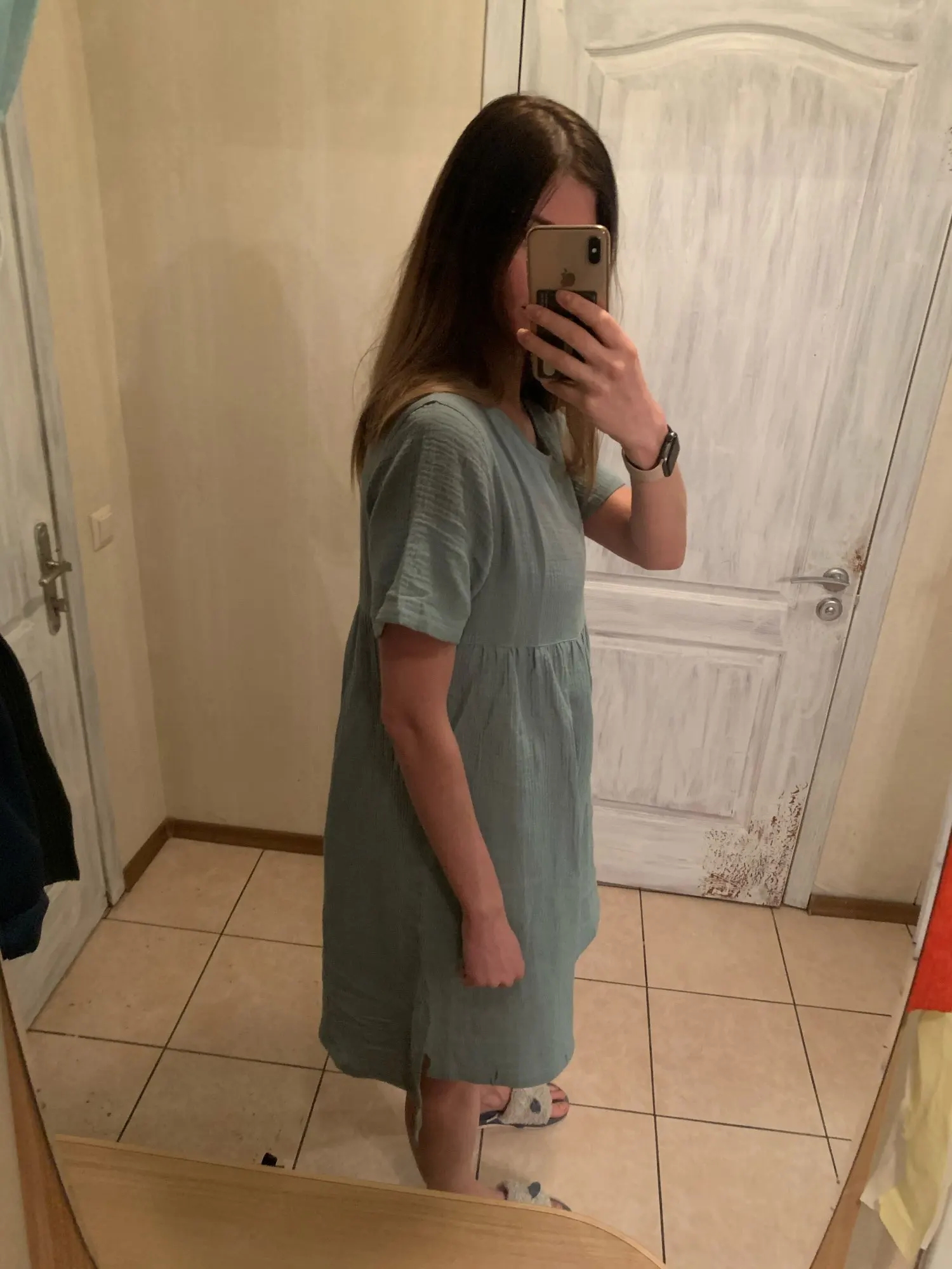 Заказ пришёл в Украину (Киев) за 5 недель, брала 11.11, думаю в нераспродажный период посылка дошла бы быстрее. На мне размер -“L”, в жизни ношу xs-s. Мой рост- 175см. Грудь-75В Материал 100% хлопок; ткань- марлевка двухслойная, не хлипкая, плотная, темное нижнее белье не просвечивает. Швы ровные, ниток нет. Изделие спереди короче (91,5см) доходит до начала колена, сзади длиннее (100см); Плечи- 38см; от подмышки до подмышки- 48см; рукав-21см; Оба цвета припыленные,зеленый цвет (субъективно) лучше смотрится. Покупала чтобы ходить по дому, но можно и на улицу при желании. Хорошо подойдет беременным