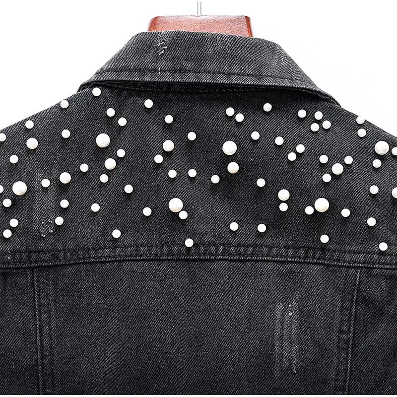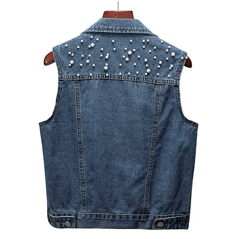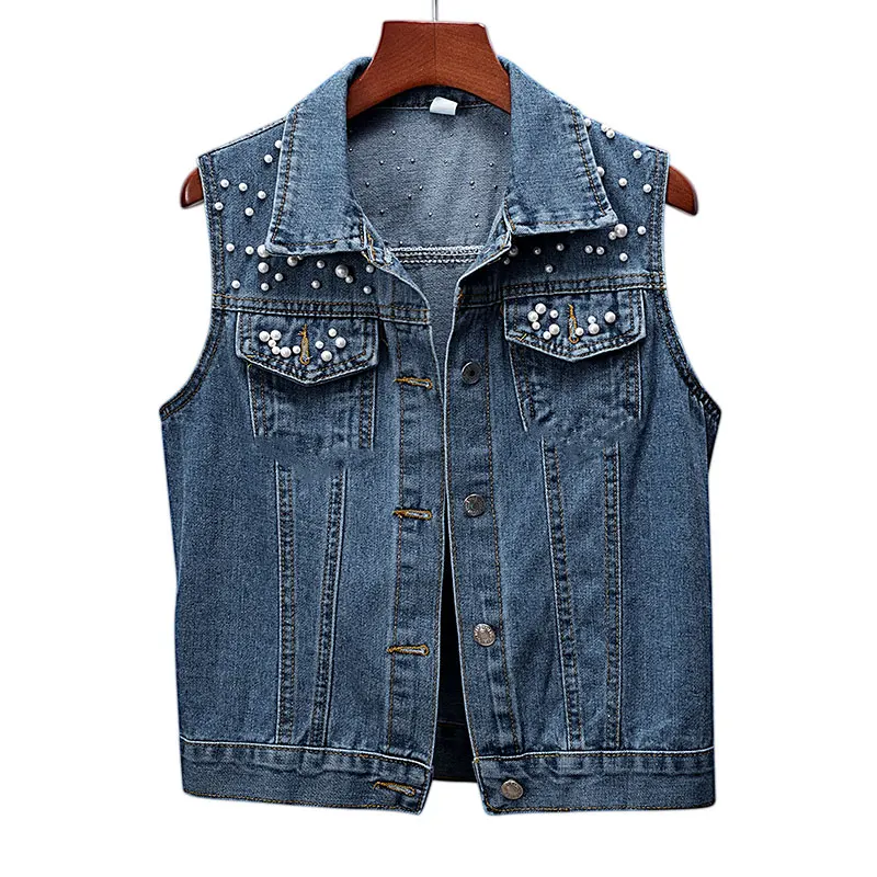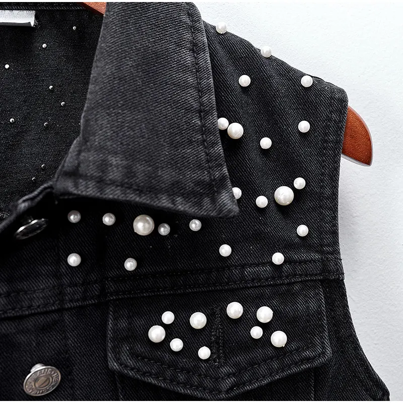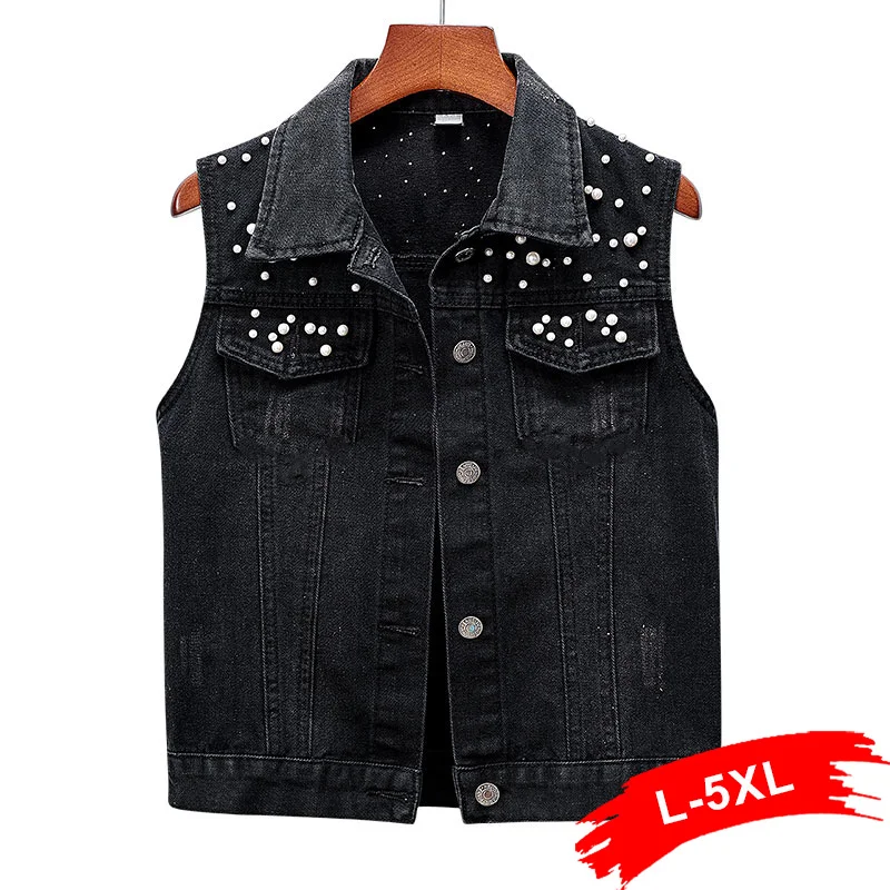 Женский джинсовый жилет без рукавов, черный облегающий жилет из денима с жемчужными бусинами, Корейская джинсовая куртка размера XXL, короткие джинсовые куртки на лето