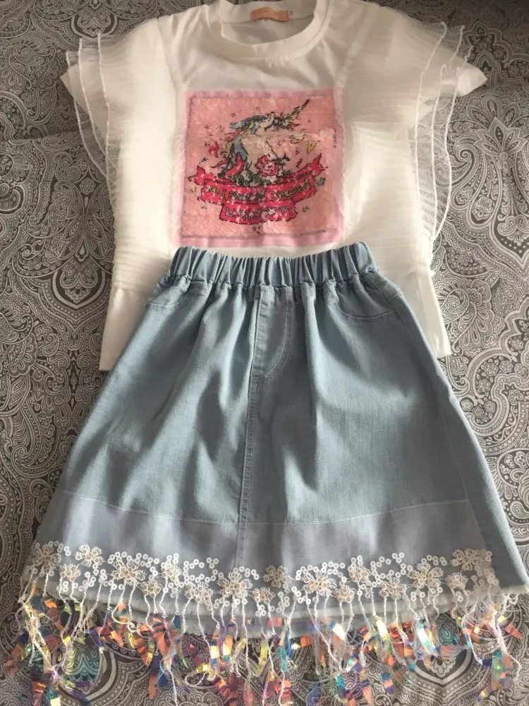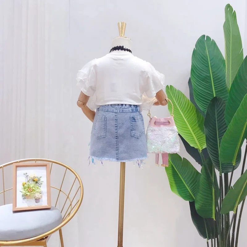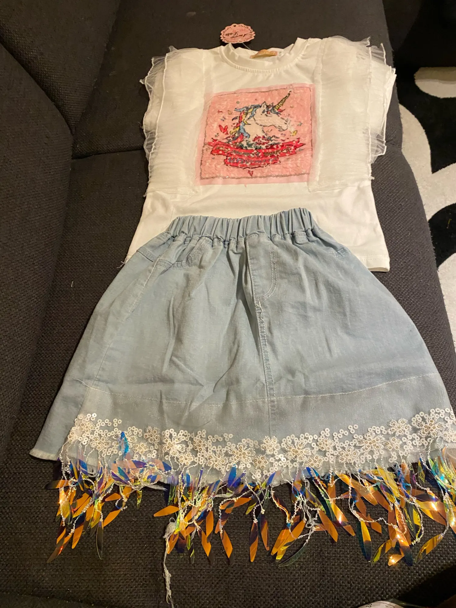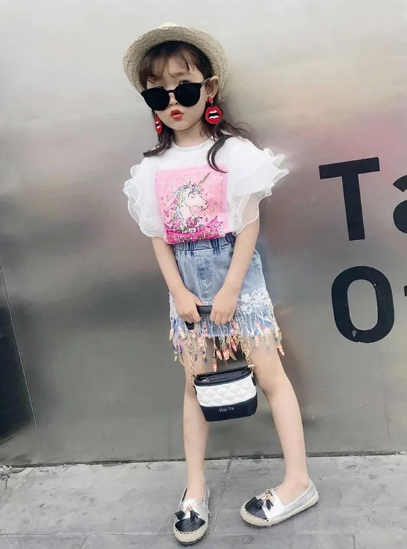 Кружевная рубашка с единорогом и джинсовая юбка с блестками, Модный комплект одежды для маленьких девочек, красивые детские летние наряды, симпатичная одежда