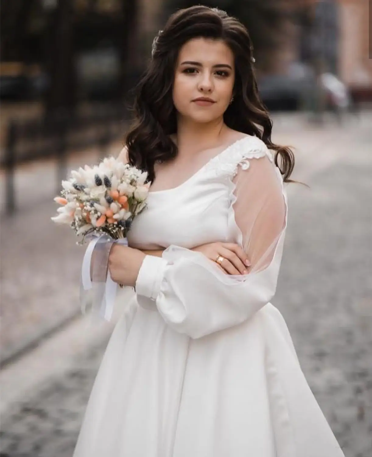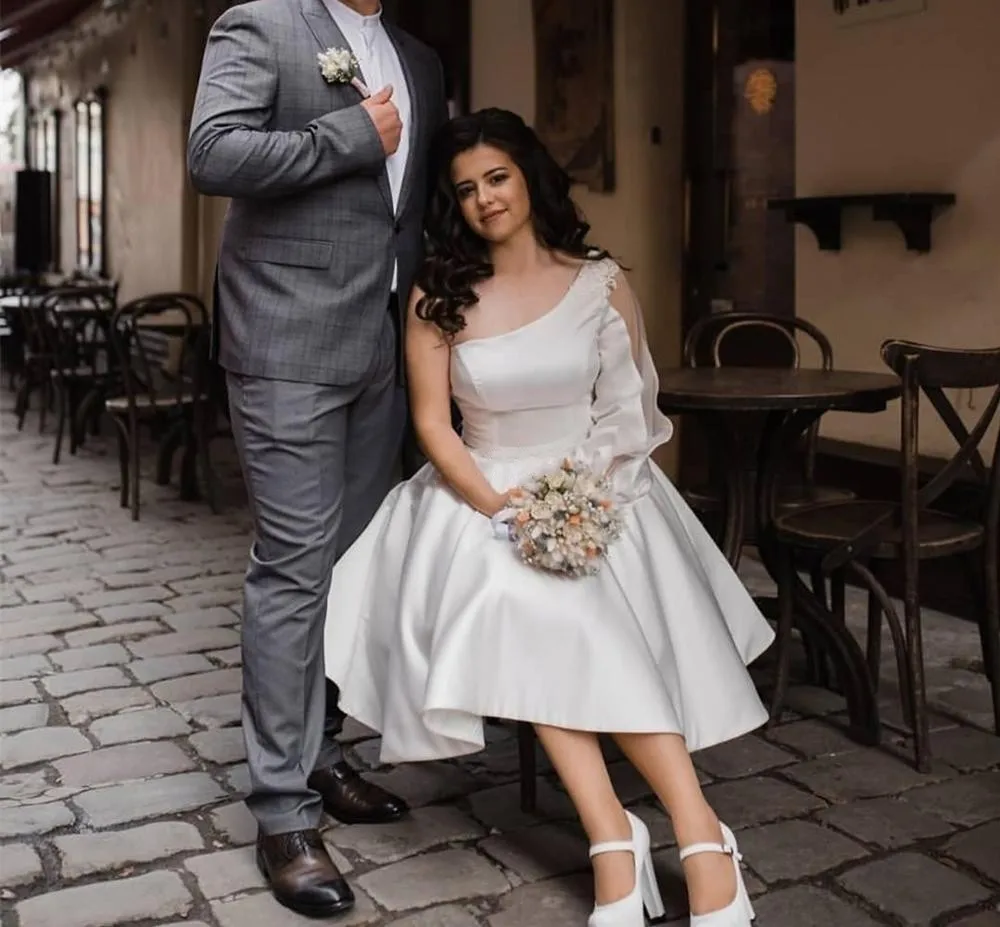 JIERUIZE белые свадебные платья на одно плечо с одним длинным рукавом атласные Короткие свадебные платья vestido de noiva