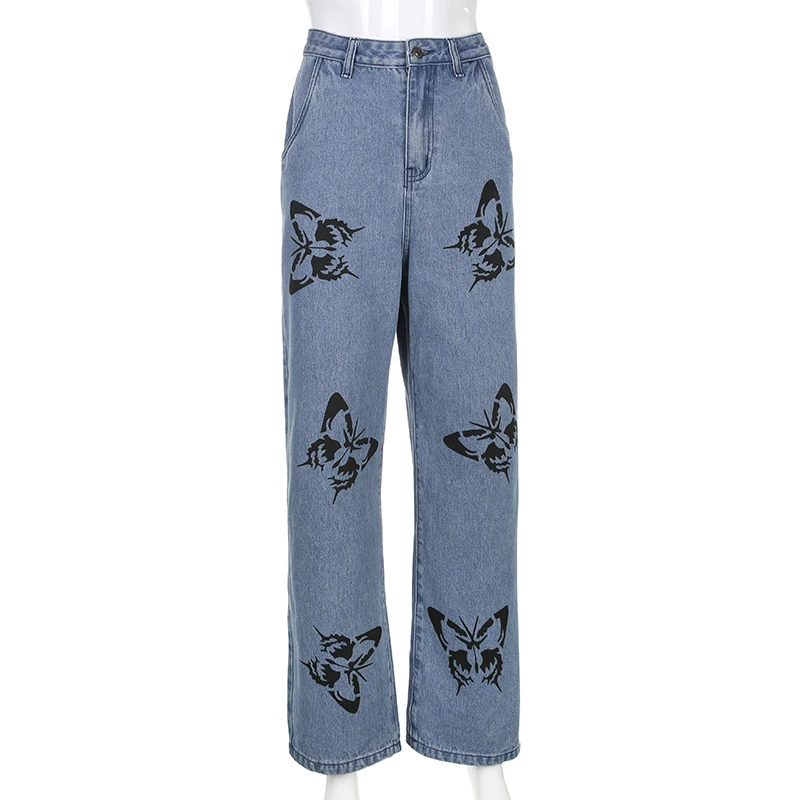 Женские джинсы с принтом бабочки Y2k, свободные широкие джинсовые б...